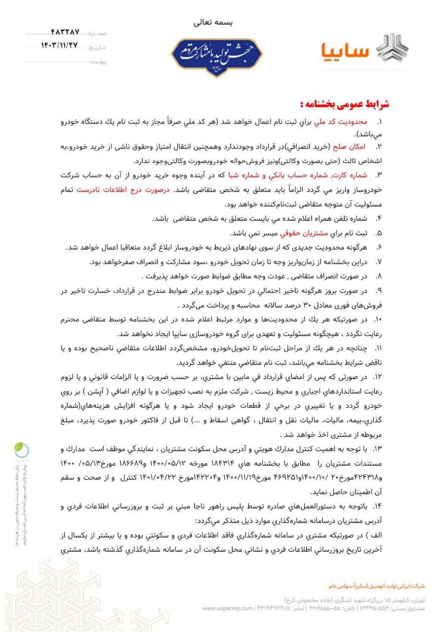 این طرح با محدودیت کد ملی اجرا شده و هر کد ملی تنها یکبار امکان ثبتنام دارد. همچنین مطابق ضوابط تعیینشده، امکان صلح یا خرید خودروهای انصرافی برای متقاضیان وجود نخواهد داشت.