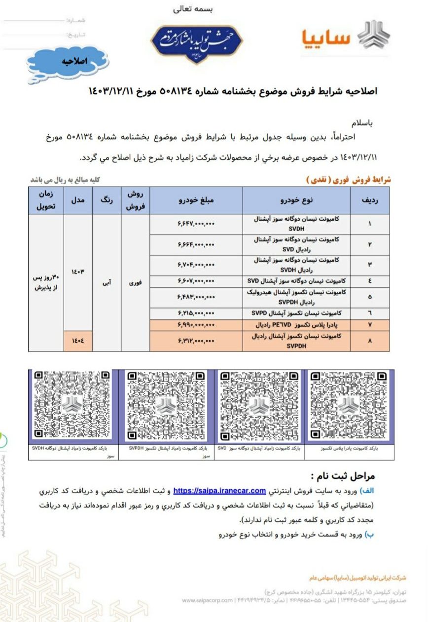 شرایط جدید فروش فوری نقدی و اقساطی انواع وانت نیسان زامیاد ویژه آذر ۱۴۰۲ از سوی سایپا اعلام شد. این بخشنامه از ساعت ۱۱ روز سهشنبه مورخ 13 آذرماه تا زمان تکمیل ظرفیت برقرار است: