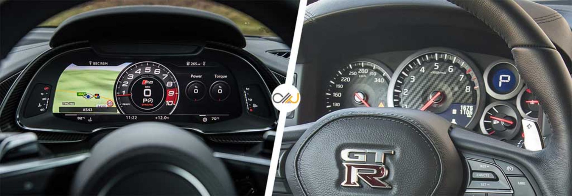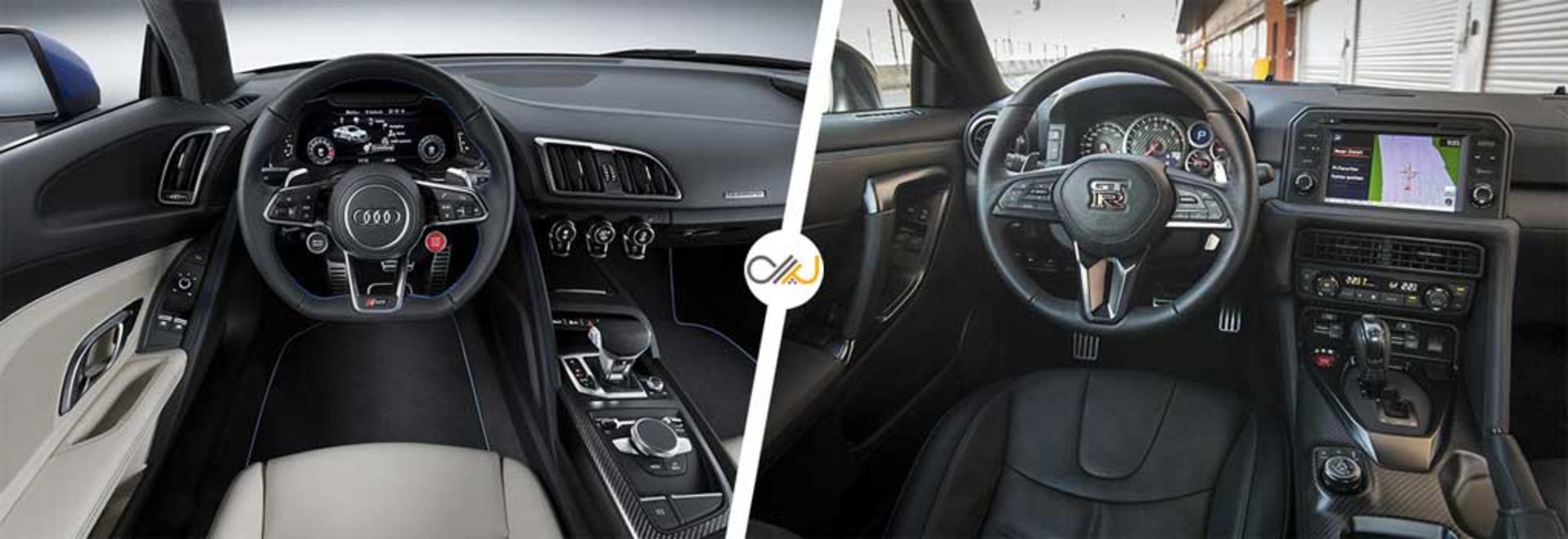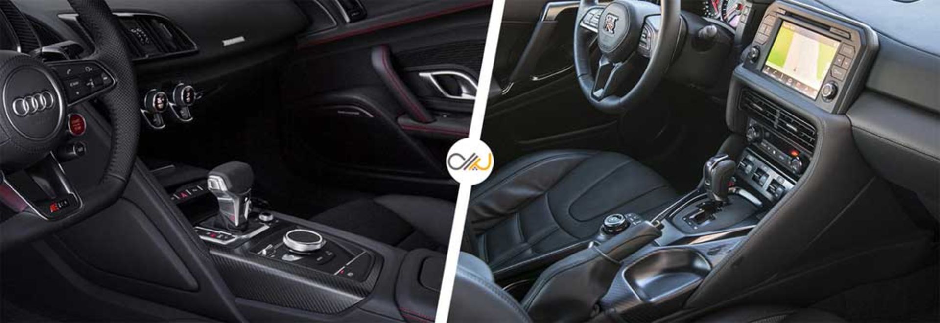 شهرت آئودی به ساخت فضای داخلی زیبا است که این رویه در R8 هم رعایت شده است. کابین این خودرو راننده محور بود و از مواد باکیفیتی در ساخت آن استفادهشده است که واقعاً حس کیفیت را منتقل میکند. در این خودرو سامانهٔ اطلاعاتی-سرگرمی MMI آئودی به همراه صفحه آمپر دیجیتال مجازی وجود دارد. هنگامیکه وارد کابین GT-R میشویم میبینیم که فضای داخلی آن هرگز به مدرنی بسیاری از خودروهای این کلاس نیست. هرچند پوشش داخلی چرمی در این خودرو بکار رفته است اما در کل کابین آن بسیار ساده بوده و احساس پریمیوم را مانند رقبای خود ندارد.