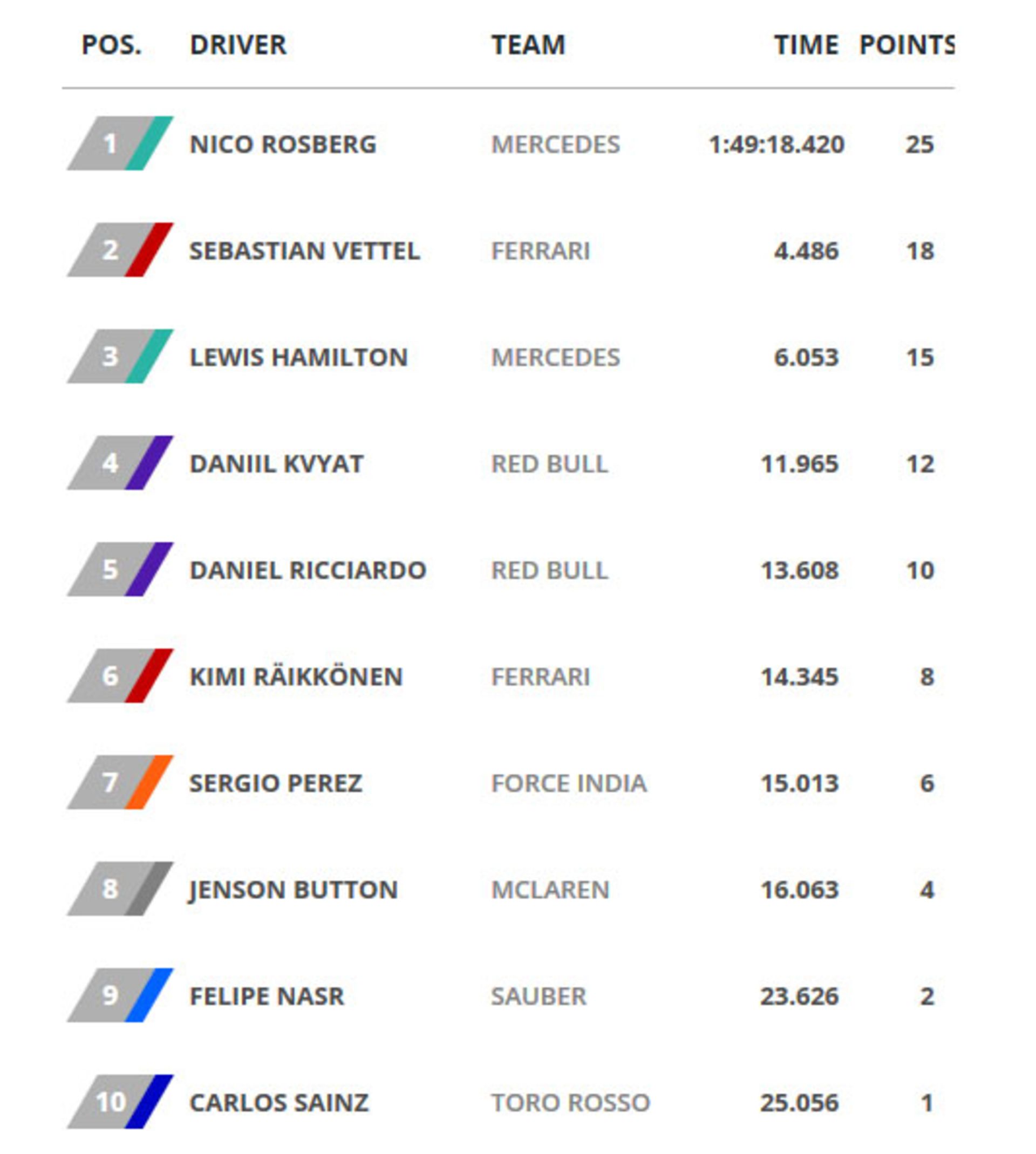 در ردهبندی رانندگان تا این مسابقه، همیلتون همچنان با 126 امتیاز در صدر قرار دارد و نیکو رزبرگ با 116 امتیاز در تعقیب اوست. سباستین وتل نیز به امتیاز 98 رسیده است. در ردهبندی تیمی هم مرسدس با 242 امتیاز، پیشتاز بلامنازع این فصل است و فراری با 158 امتیاز و ویلیامز با 81 امتیاز در ردههای دوم و سوم قرار دارند. مسابقه بعدی دو هفته دیگر در کانادا برگزار خواهد شد.