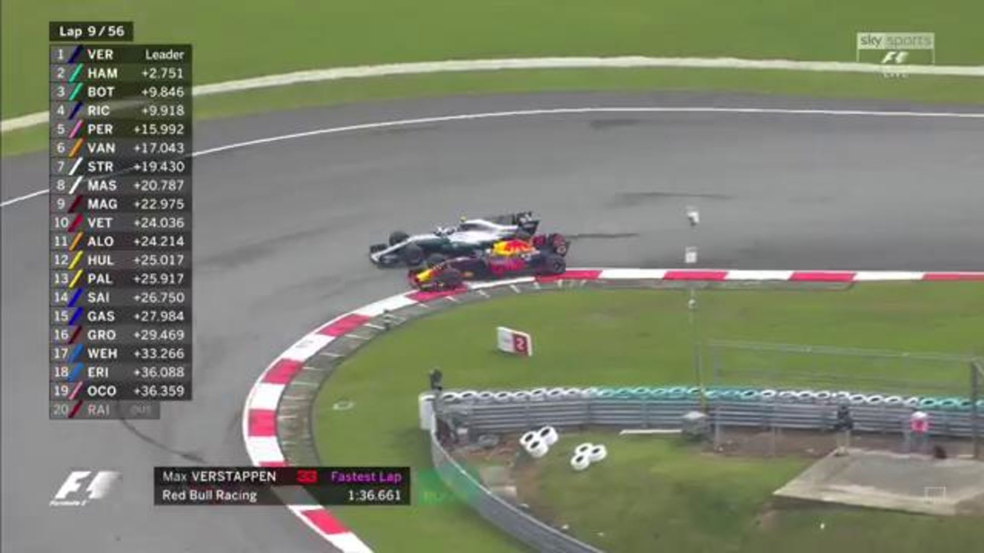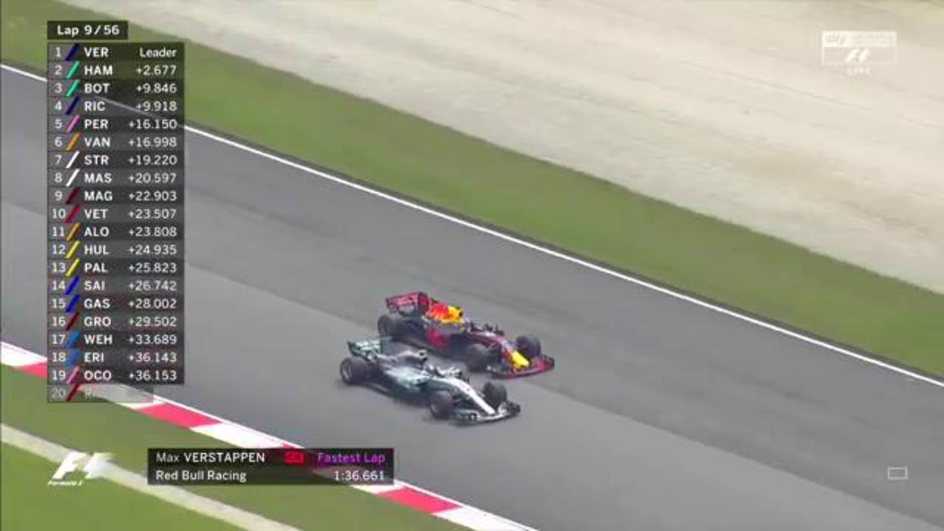 در دور 4 ورستپن از همیلتون سبقت گرفته و پیشتازی را به‌دست گرفت. حال مرسدس‌ها در ساندویچ ردبول گیر کرده بودند. تا دور 8 ورستپن بیش از 2 ثانیه با همیلتون فاصله باز گرده بود. اما 9 ثانیه پشت سر ورستپن، ریکاردو کمتر از یک ثانیه با بوتاس فاصله داشت و مترصد فرصتی برای سبقت بود.در ابتدای دور 9 ریکاردو سبقت زیبایی از بوتاس گرفت. او در پیچ راست‌گرد 1 از بیرون اقدام به سبقت‌گیری کرد و در پیچ چپ‌گرد 2 درست در کنار بوتاس قرار داشت. در سرازیری خروج از پیچ 2 بوتاس جلو افتاد ولی در ورود به پیچ 4 ریکاردو به‌خوبی از داخل وارد پیچ شد و بوتاس دیگر نتوانست دفاع کند. سپس ریکاردو به‌سرعت فاصله گرفت و تا دو دور بعد فاصله‌ای 4 ثانیه‌ای با بوتاس باز کرد.
