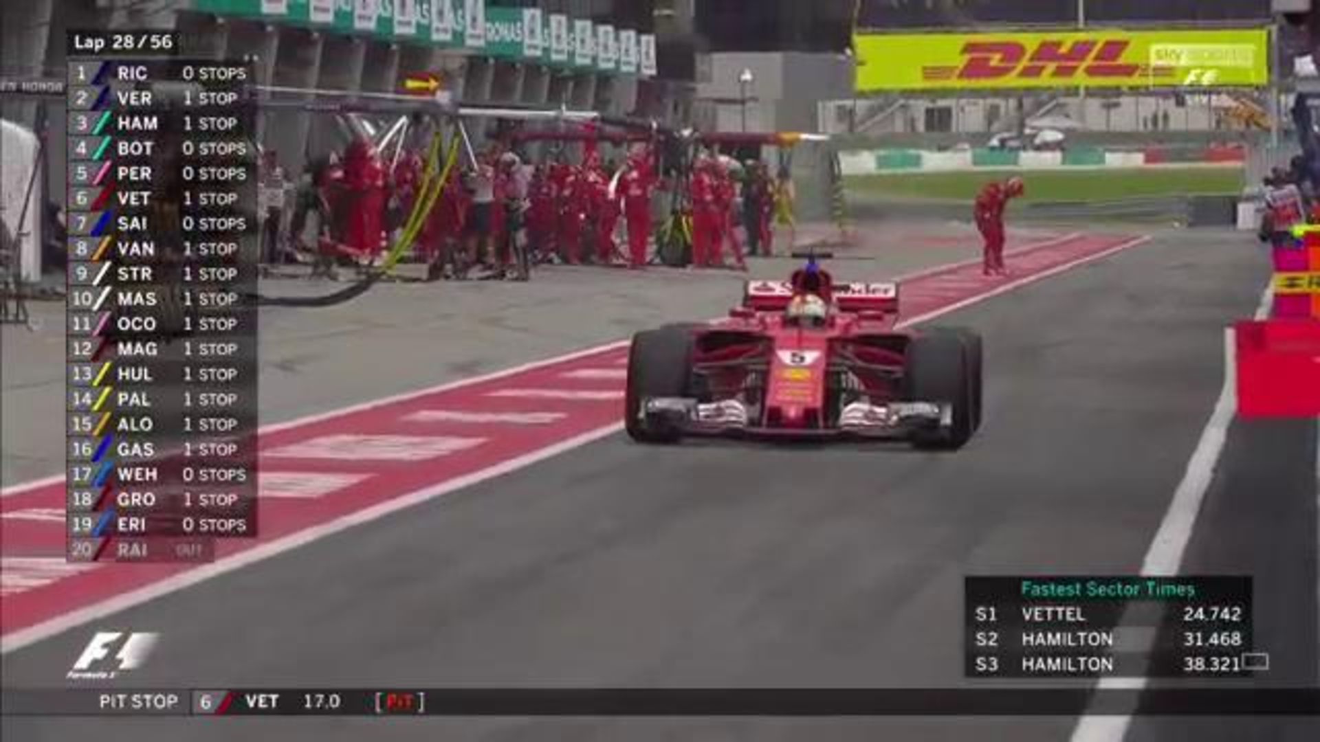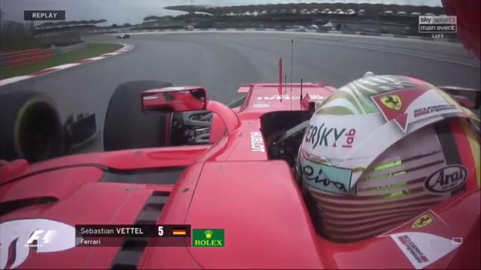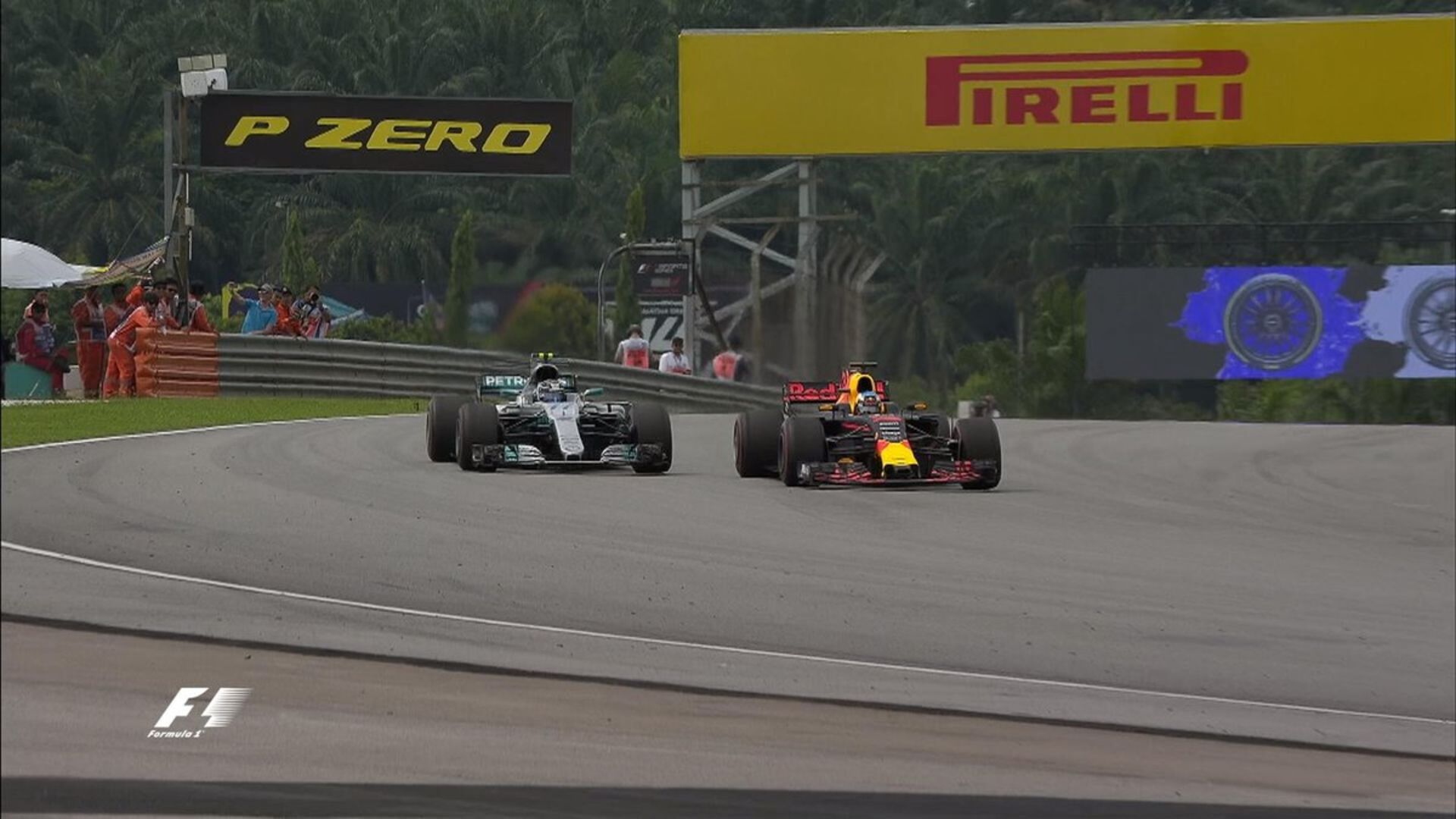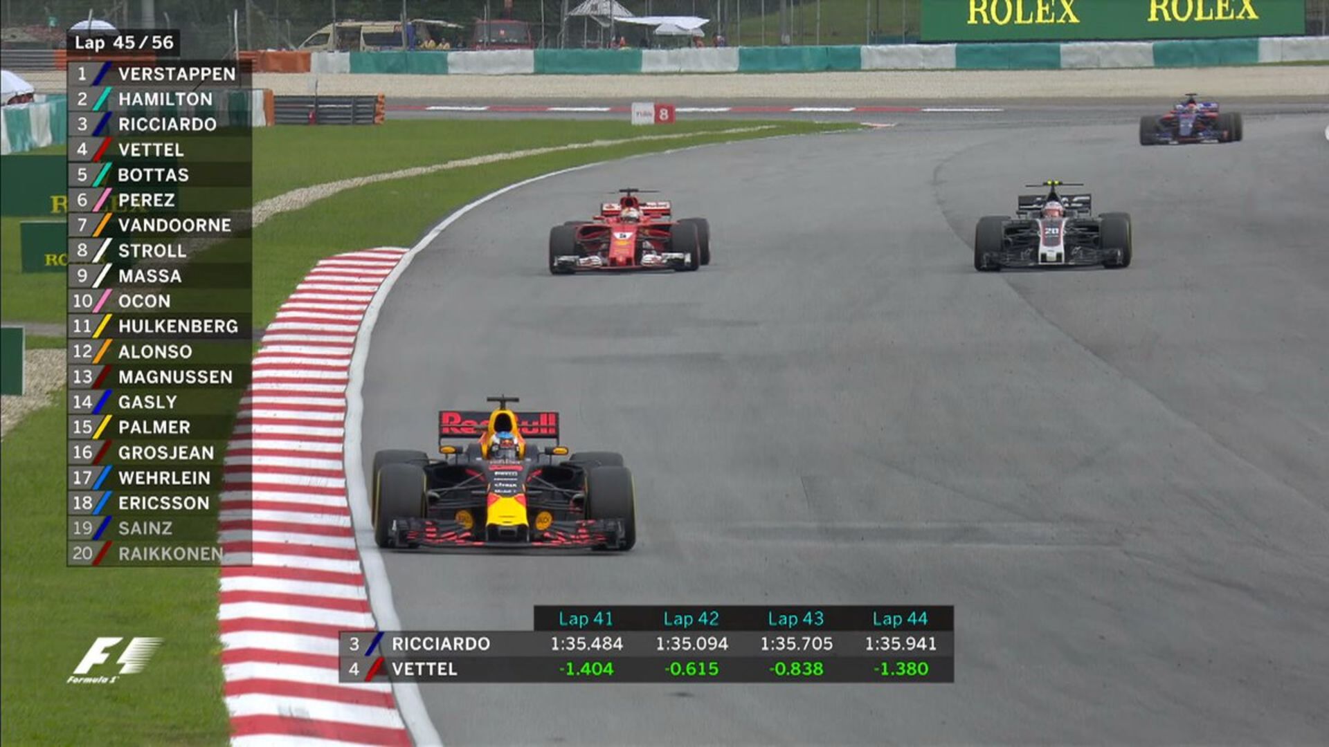 فتل با لاستیک‌های جدید در حال ثبت سریع‌ترین دورها بود و فاصله خود را با ریکاردو کم می‌کرد. از طرفی ریکاردو نیز فاصله خود را با همیلتون به زیر 10 ثانیه رسانده بود. فتل در دور 42 رکورد پیست سپانگ را نیز جابه‌جا کرد. او با عملکرد خوب خود در 6 دور، 8 ثانیه به همیلتون نزدیک شد و در دور 44، در فاصله 4 ثانیه‌ای ریکاردو قرار داشت. این فاصله در ابتدای دور 45 به 2.2 ثانیه رسید.