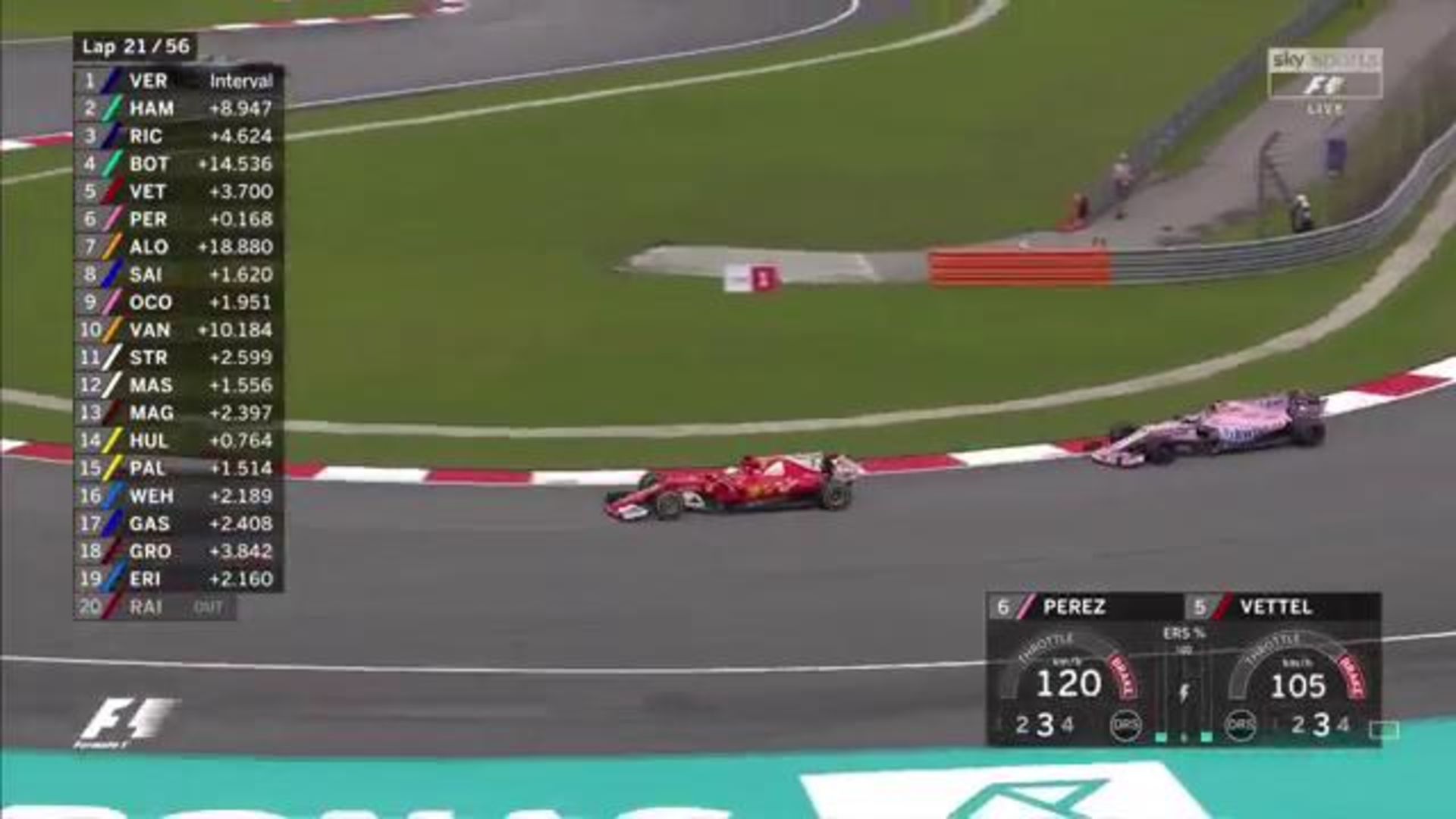 اکثر رانندگان با لاستیک‌های سوپرسافت مسابقه را شروع کرده بودند. فقط سباستین فتل و رانندگان سائوبر از سافت استفاده می‌کردند. وندورن و پرز پشت سر 4 نفر برتر قرار داشتند، سپس رانندگان ویلیامز و بعد از آن‌ها نیز مگنوسن، آلونسو و فتل باهم درگیر بودند. فتل تا دور 12 خود را به پشت سر رانندگان ویلیامز در رده نهم رساند. بعد از سبقت از آلونسو و به پیت رفتن رانندگان ویلیامز، فتل پشت سر سرجیو پرز در رده ششم قرار داشت. او تا دور 20 فاصله چندثانیه‌ای خود را با پرز به زیر 1 ثانیه رساند و تلاش داشت از او سبقت بگیرد. موتور پرقدرت مرسدس که در قلب خودروی فورس ایندیای سرجیو پرز می‌تپید، کار را سخت می‌کرد. بالاخره در ابتدای دور 21 و با استفاده از DRS فتل سبقت خود را از پرز کامل کرد و در پیچ اول فتل درست در جلوی پرز قرار داشت و با ورود درست به پیچ، سبقت خود را کامل کرد.
