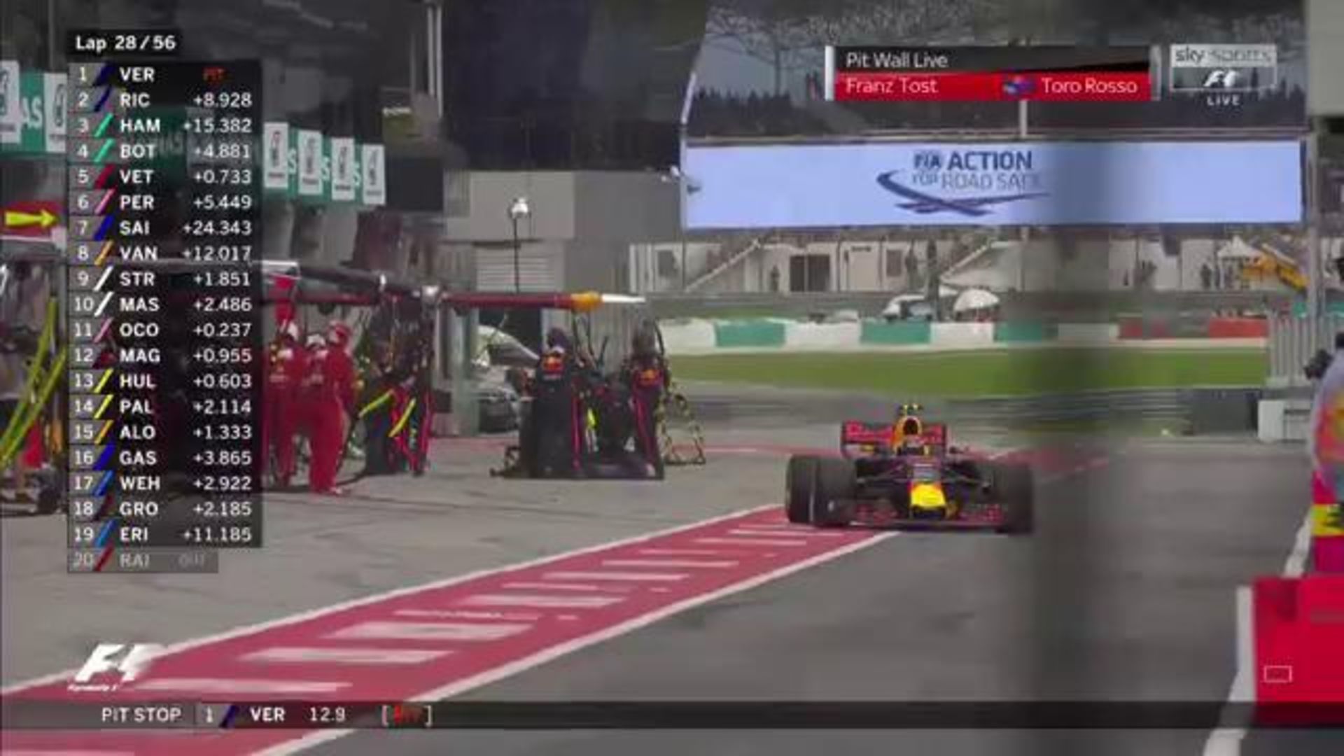 شرایط رانندگان جلویی تغییر چندانی نکرده بود. ورستپن بافاصله حدود 10 ثانیه، پیشتاز بود و 4 ثانیه بعد از همیلتون، ریکاردو در حال نزدیک شدن بود. فاصله بوتاس و ریکاردو زیاد بود و فتل که بعد از سبقت از پرز، بوتاس را در 3 ثانیه‌ای خود می‌دید، حال به او نزدیک شده بود و پشت سر او رانندگی می‌کرد. در دور 26 فتل و بوتاس باهم درگیر شدند و فتل در پیچ 4 به بوتاس حمله کرد، اما این حمله موفق نبود و فتل موفق به سبقت‌گیری نشد. در همین حال در ابتدای دور 27 همیلتون به پیت رفت و با لاستیک سافت برگشت، او در برگشت به پیست جلوی بوتاس قرار گرفت. سپس در ابتدای دور 28، ورستپن و فتل به پیت رفتند. فتل لاستیک خود را با سوپرسافت تعویض کرد و ورستپن از لاستیک سافت استفاده کرد. در ابتدای دور بعد بوتاس به پیت رفت و در خروج، پشت سر فتل قرار گرفت. حال فتل فقط ورستپن، همیلتون و ریکاردو را در مقابل خود می‌دید. اما او 14 ثانیه با ریکاردو که در رده سوم بود فاصله داشت و بوتاس نیز 5 ثانیه بعد از او در حال مسابقه دادن بود.