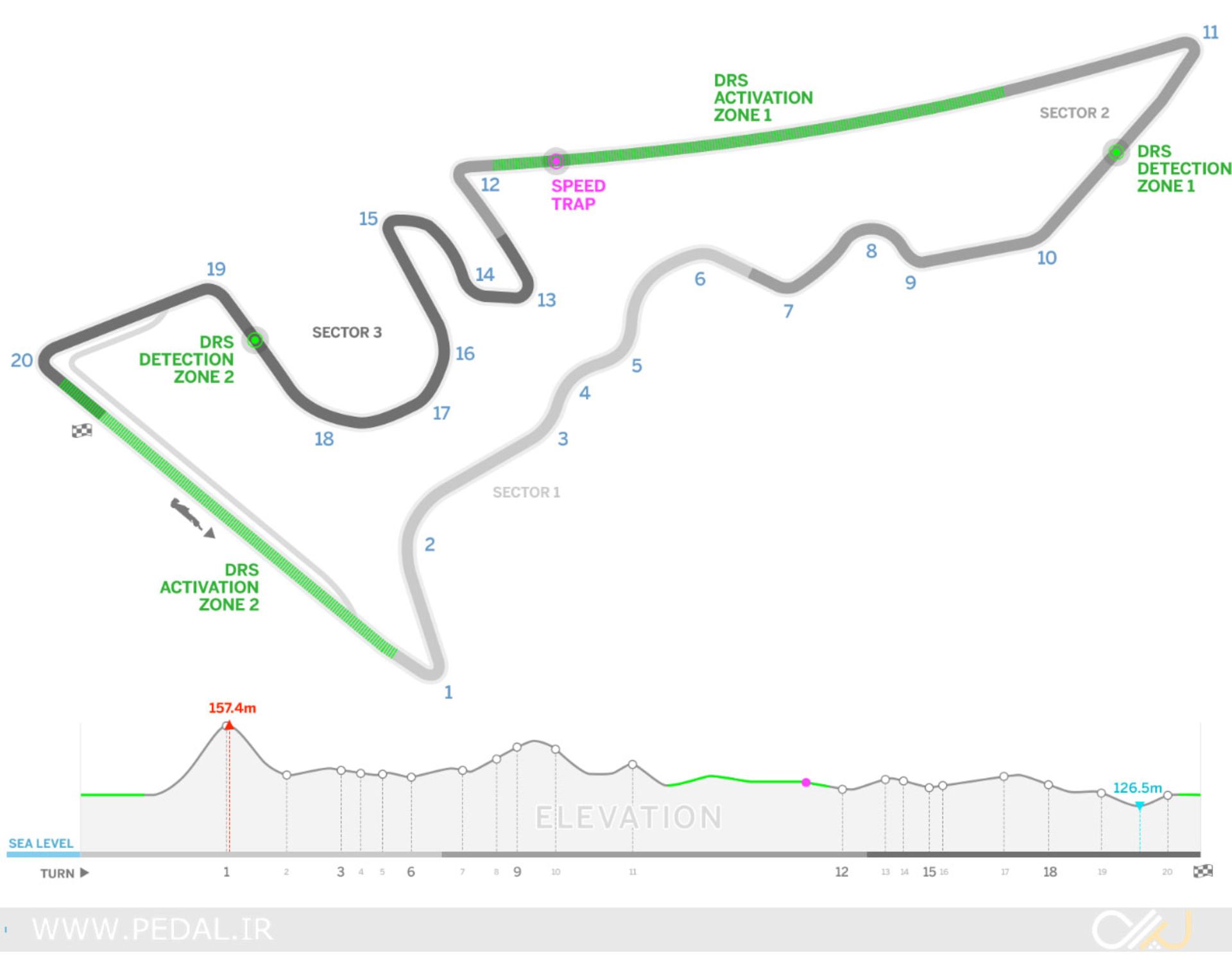 قبل از رسیدن به پیچ 1 شیب تندی به سمت بالای تپه وجود دارد که امضای این پیست است. پیچهای 3 تا 6 به پیچهای پرسرعت Maggotts و Becketts سیلوراستون بیشباهت نیستند. پیچهای 12 تا 15 به جایگاه استادیوم هوکنهایم گرهخورده و پیچهای 16 تا 18 نیز پیچ مشهور شماره 8 استانبول پارک را یادآوری میکنند.