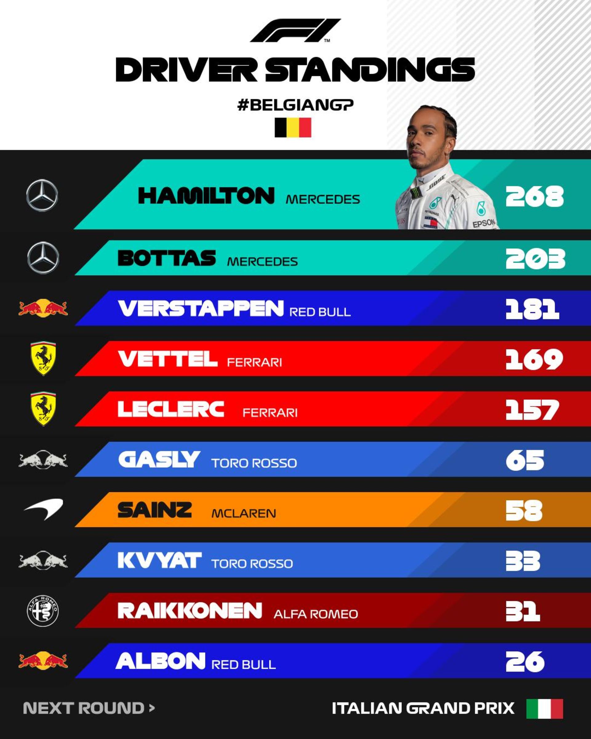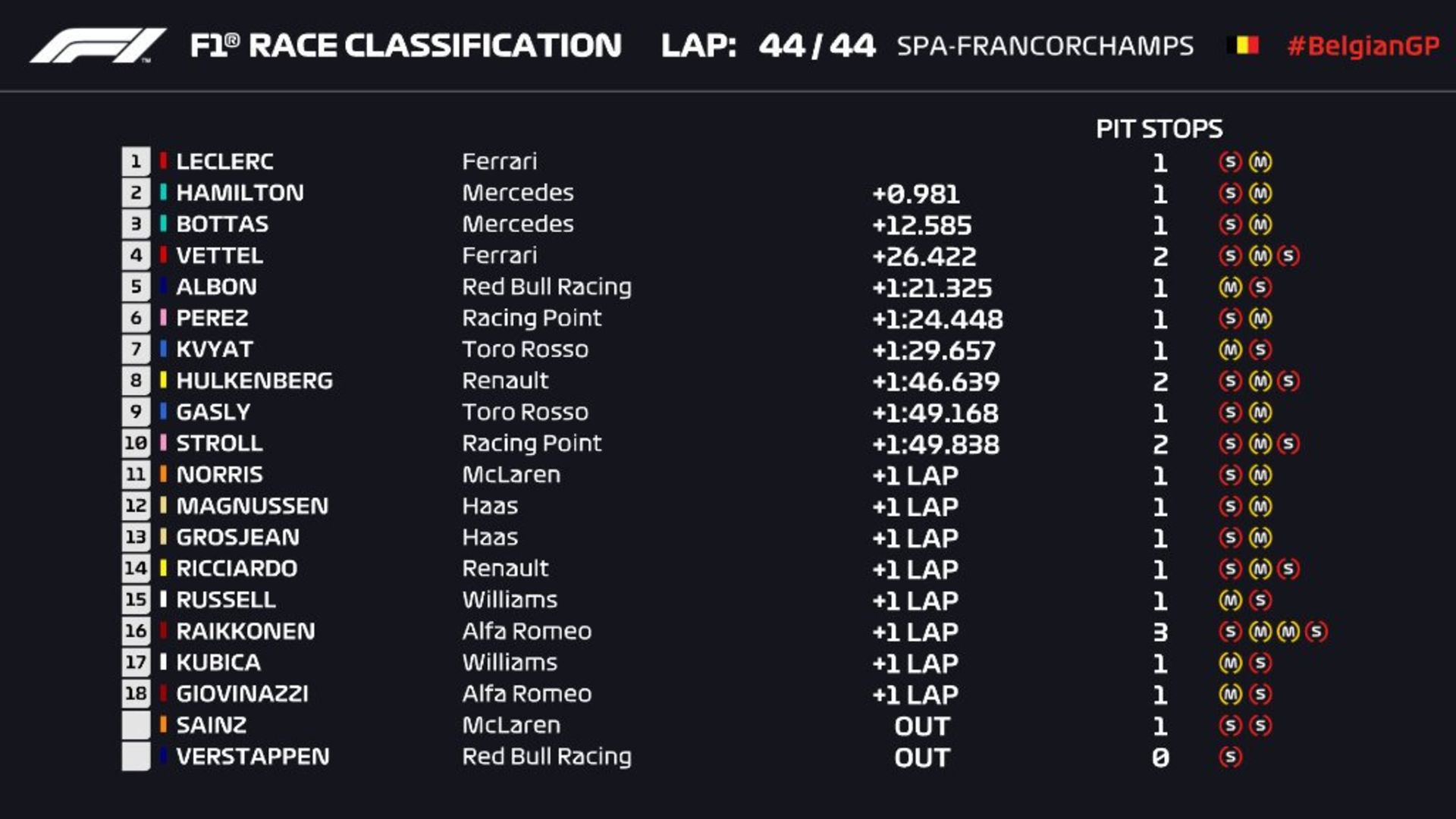 همیلتون و بوتاس هم سکوهای دوم و سوم را کسب کردند و فتل با وجود فداکاری، به مقام چهارمی بسنده کرد. این مسابقه برای فراری از این جهت که توانست فاصله خود و ردبول را ترمیم نماید نیز با ارزش بود.
