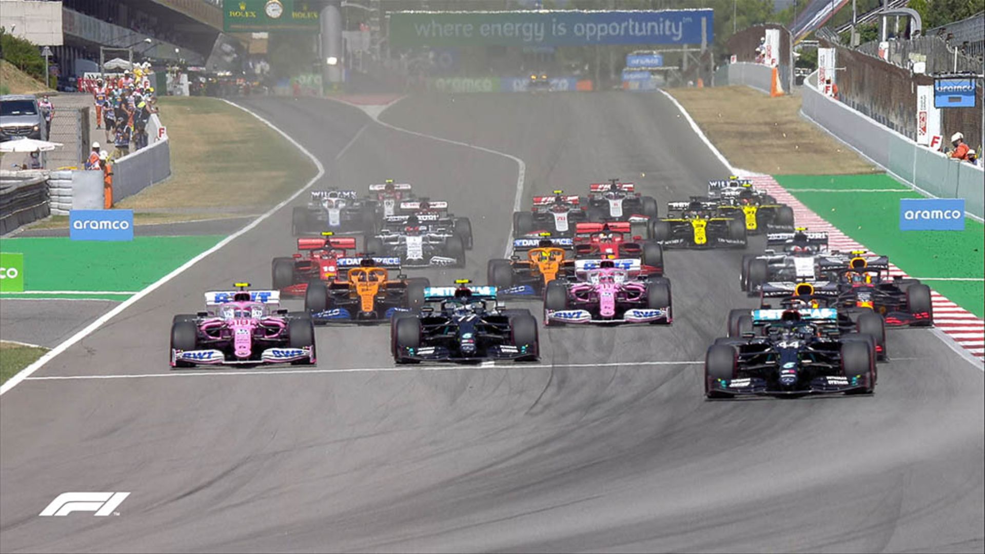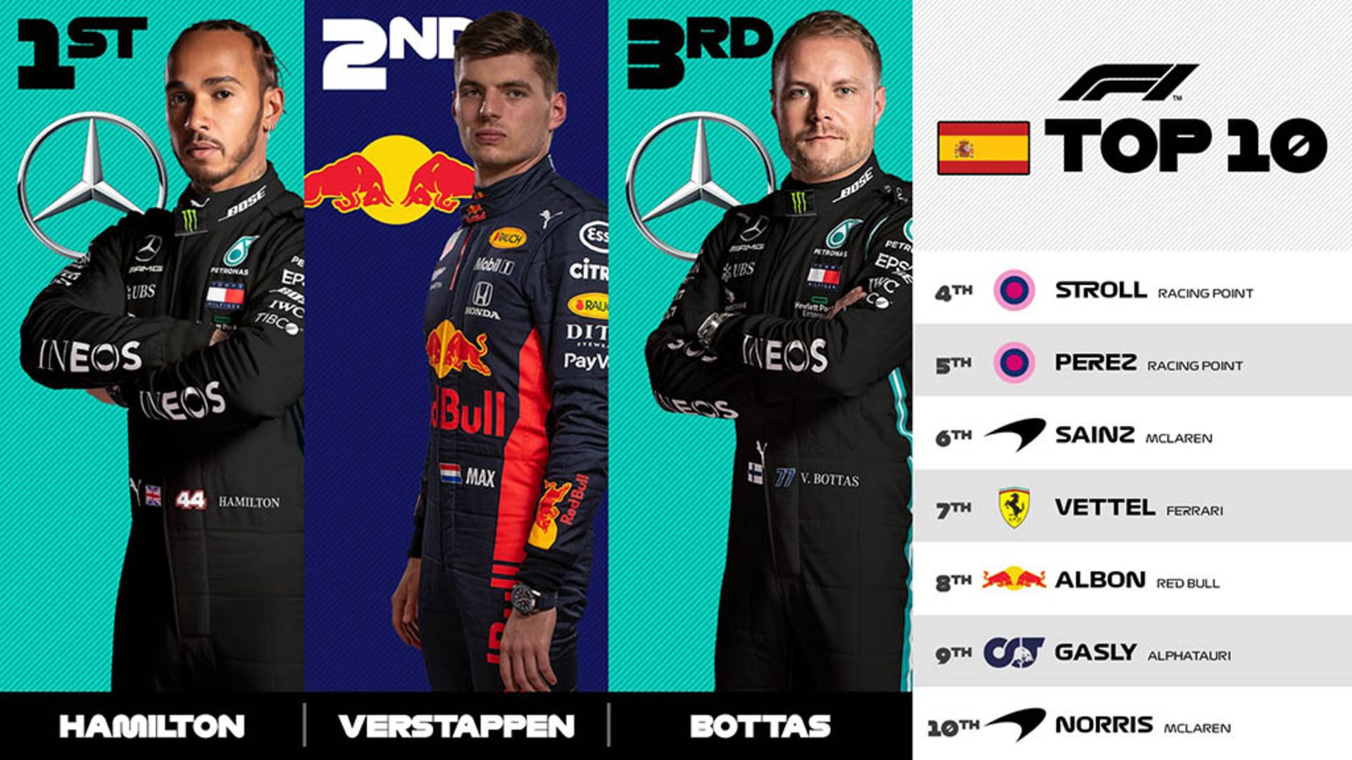 ششمین مسابقه جایزه بزرگ فرمول یک این فصل در بارسلون اسپانیا پی گرفته شد. در این مسابقه بازگشت سرجیو پرز بعد از منفی شدن تست کویید 19 او و غیبت در دو مسابقه با کسب خط چهارم استارت همراه بود. همیلتون و بوتاس هم پول پوزیشن وخط دوم را در اختیار داشتند و ورشتاپن از سومین رده مسابقه را شروع کرد.