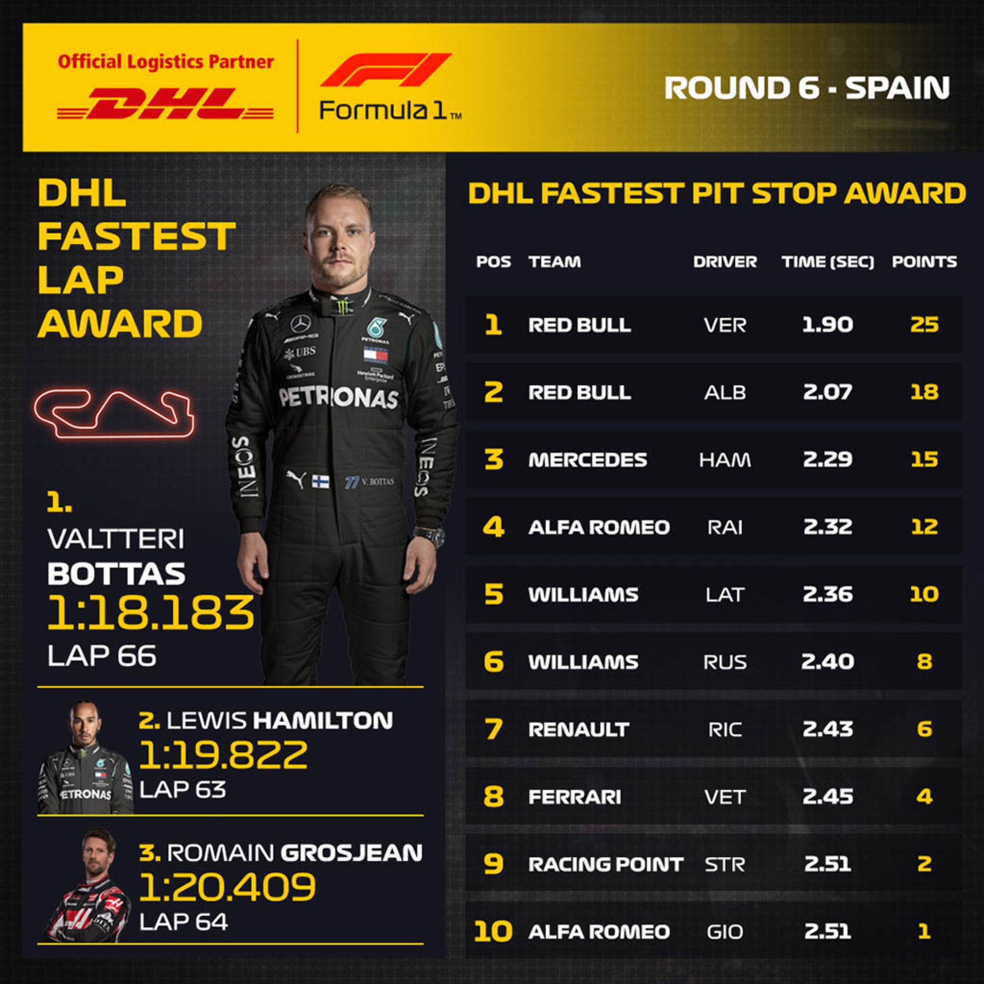 ورشتاپن هم بدون تنش خاصی دوم شد و بوتاس با کسب رده سوم و همچنین امتیاز سریع ترین دور پیست، رکورد سرعت این پیست را هم جابجا کرد.