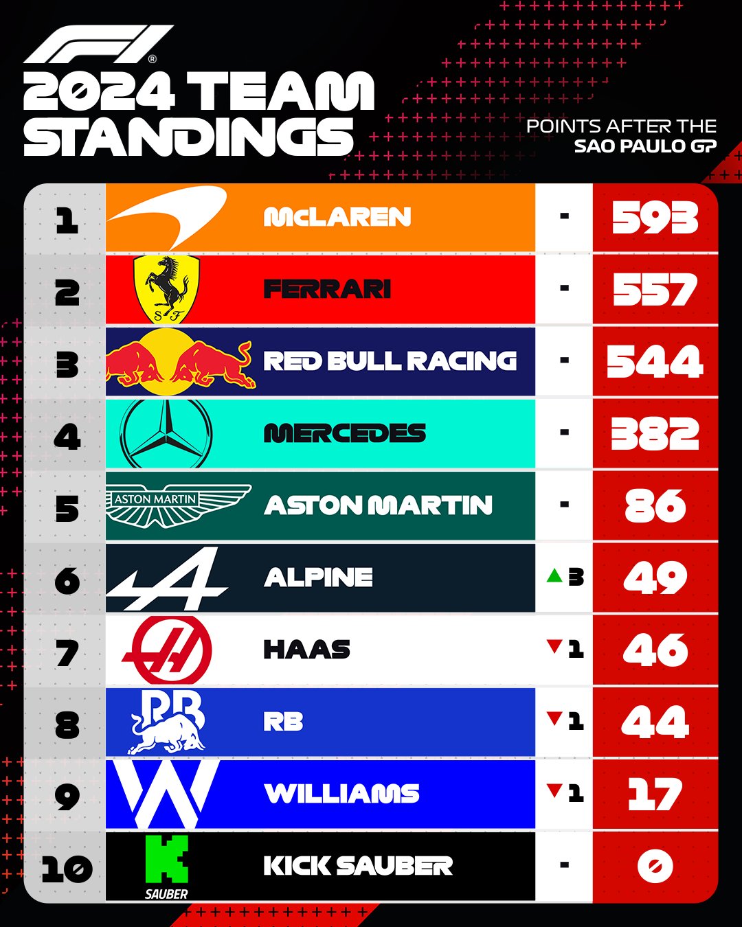 میان تیمهای بالا نشین در فرمول یک امسال، شرایط مشابه هفته قبل است. مکلارن 593 امتیازی با 36 امتیاز بیشتر، صدر جدول را در اختیار دارد، فراری با 557 و ردبول با 544 امتیاز، دوم و سوم هستند. دیگر تیمهای شرکت کننده در فرمول یک ۲۰۲۴، شامل مرسدس، استون مارتین، در ردههای بعد دیده میشوند. آلپین به لطف درخشش رانندگان در مسابقهی برزیل، سه پله بالا آمده و حالا ششم جدول است.