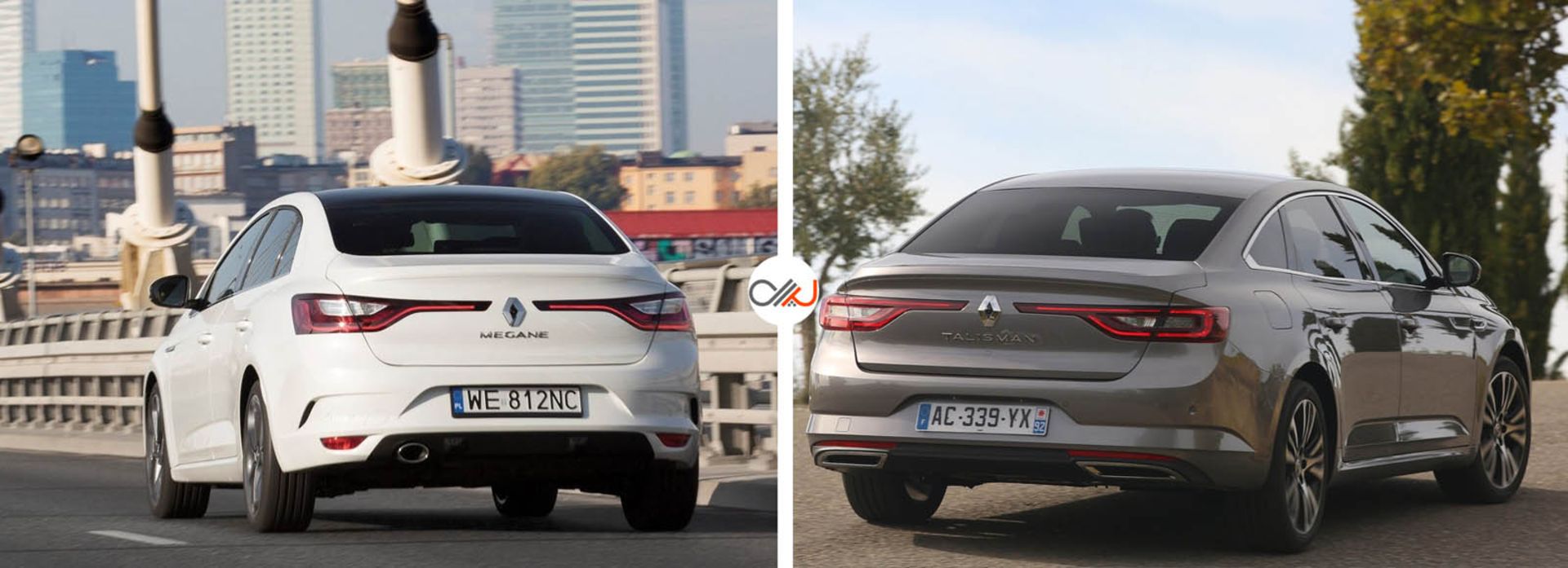 در تلیسمان اما چراغ‌ها ذوزنقه مرتب‌تری هستند که یکی از اضلاعش به سمت مرکز امتداد می‌یابد، دورتادور چراغ مخصوص ترمز بوده و دنده عقب و راهنما در مرکز قرار گرفته‌اند، برآمدگی بالای محل پلاک پایین آمده و تا جانب خودرو ادامه دارد، خطی سرتاسری و موازی کمی پایین‌تر دیده می‌شود که زیرش باز بخش پلاستیکی و دو خروجی اگزوز تعبیه شده است (که انگار اصلا خروجی‌های سامانه اگزوز نیستند!). نام هر دو برادر نیز در مرکز درب صندوق بار با حروف بزرگ خودنمایی می‌کند. در کل رخ پشتی تلیسمان مسن‌تر و شیک‌تر اما مگان جوان‌تر و تاحدودی اسپورت‌تر می‌نماید.