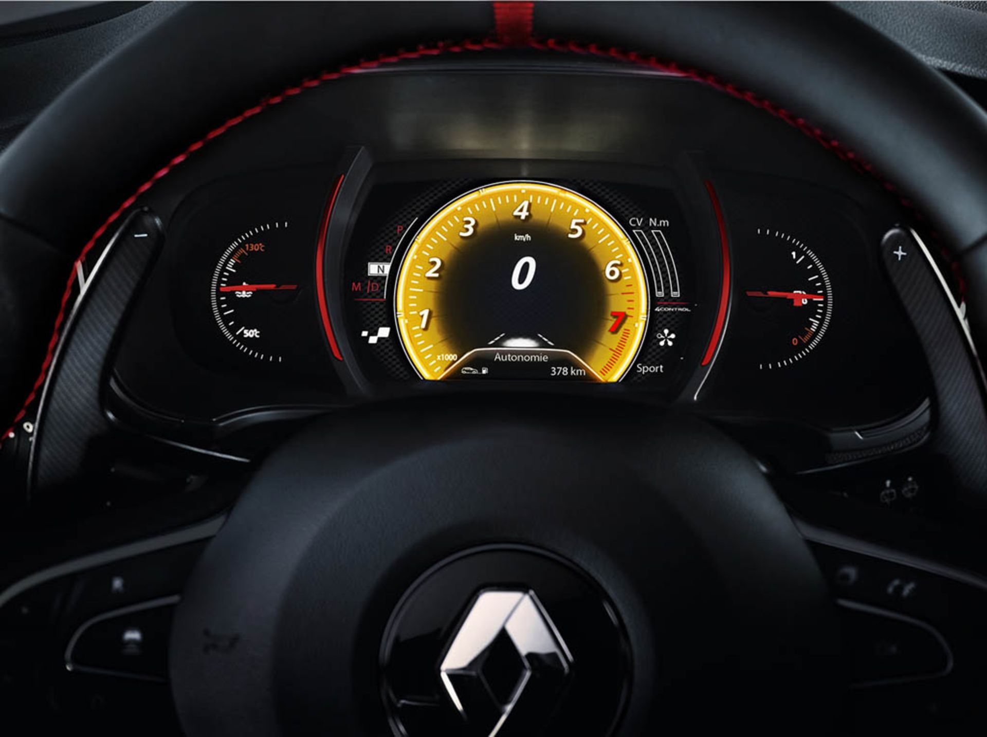 در نمای جلوی این رندرها شاهد سپر گیرایی هستیم که دارای عناصر مشکی بوده و در هر طرف آن سه چراغ کوچک قرار گرفته است. از دیگر بازنگری‌های این مدل می‌توان به نشان و جلوپنجره‌ی مشکی رنو اشاره کرد.