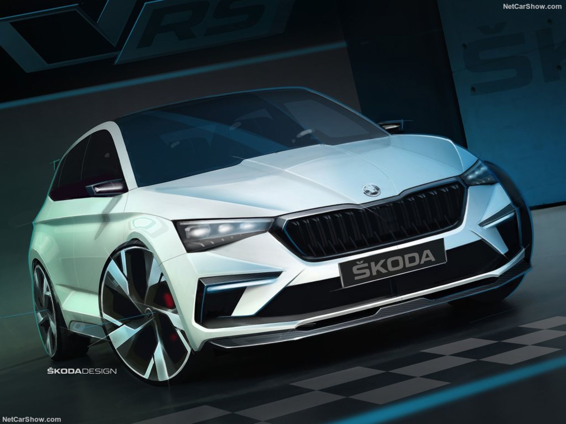 در طراحی بیرونی ویژن RS بیش از همه خطوط صریح و لبههای تیز به همراه ویژگیهایی الهام گرفته از موتوراسپرت جلبتوجه میکنند. در نمای جلویی خود کاپوتی برجسته و عضلانی، لوگوی اشکودا از جنس شیشهٔ کریستال، جلوپنجرهای جدید با تیغههای فیبر کربنی مشکیرنگ، چراغهای زاویهدار LED با طرح داخلی چهارتایی، اسپویلر فیبر کربنی و ورودی هوای بزرگ در بخش پایینی دیده میشود.