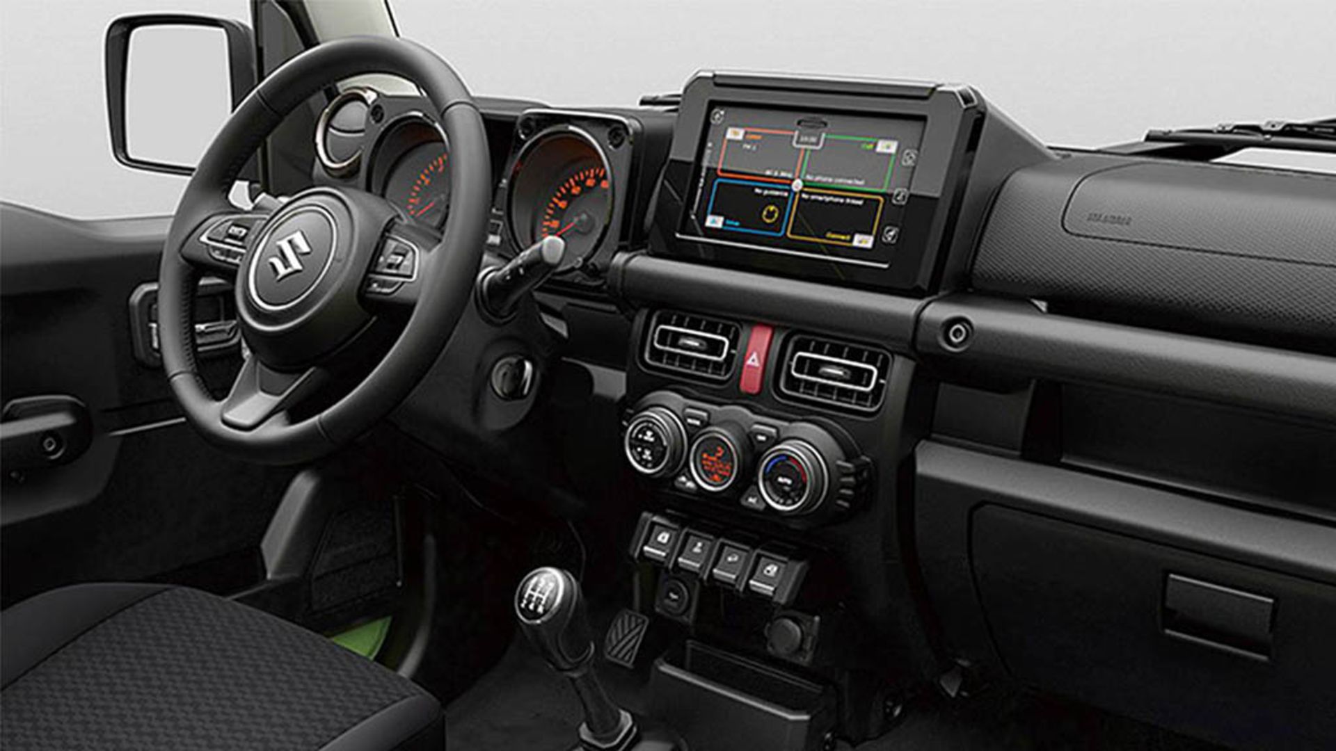 کابین نسل جدید سوزوکی جیمنی ظاهر بسیار مدرن‌تری دارد. صفحه‌نمایش لمسی سیستم اطلاعات سرگرمی در بالای کنسول نشسته و یک صفحه کوچک نیز بین پشت آمپرها وجود دارد. سوئیچ‌های سنتی هنوز هم کار تنظیم سیستم تهویه را انجام می‌دهند اما تریم فلزی باعث شده این اهرم‌ها ظاهر شیک‌تری داشته باشند. در تصاویر دیده می‌شود که نسل جدید این خودرو با گیربکس 5 سرعته دستی یا 4 سرعته اتوماتیک در دسترس است. سیستم چهار چرخ محرک با جعبه انتقال دو سرعته قطعاً آفرودی قابل را خواهند ساخت.