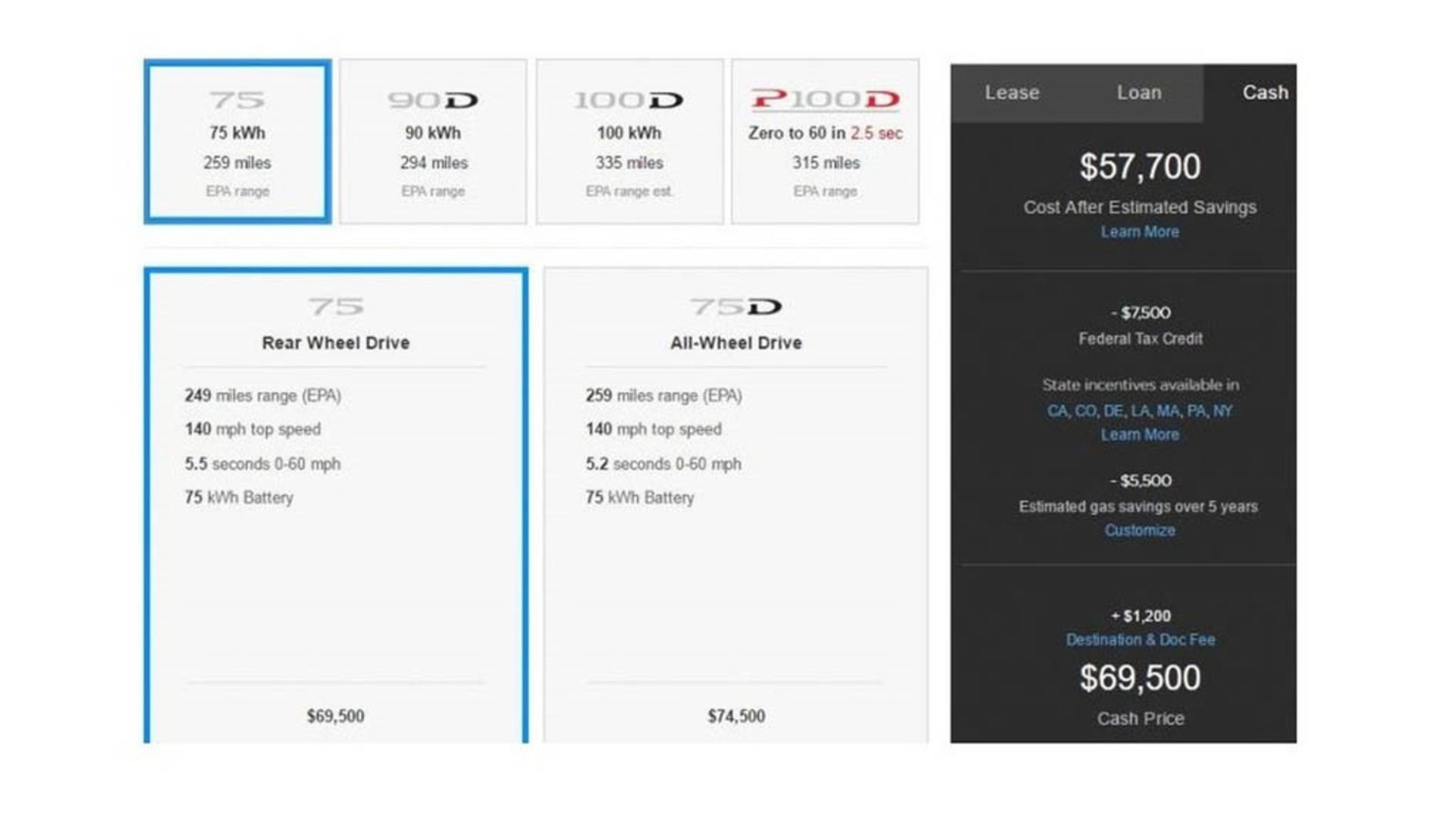 بهای تسلا مدل S که از مجموعه باتری 75 کیلووات ساعتی استفاده میکند قبلاً از 77 هزار دلار آغاز میشد اما هماکنون کاهش 7500 دلاری قیمت این خودروی الکتریکی اعلام شده است. هماکنون مدل S 75 با قیمت 69500 دلار ارزانترین مدل تسلاست که تازه می توان 7500 دلار دیگر نیز به عنوان مشوقهای ایالتی نیز از این قیمت کسر کرد.