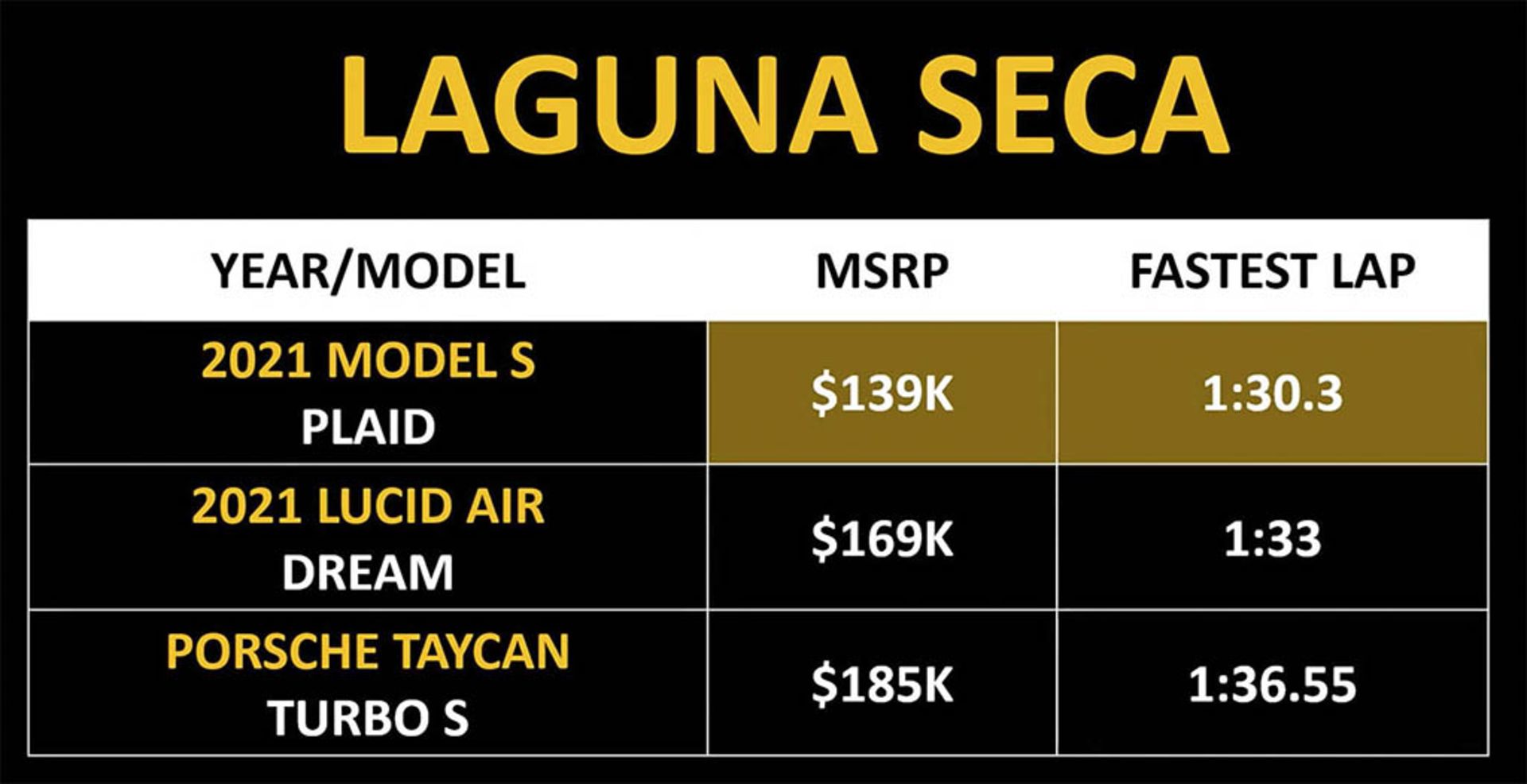 در سپتامبر 2019 بود که تسلا مدل S پلاد پروتوتایپ یک دور پیست مشهور لاگونا سکا را در 1 دقیقه و 36.55 ثانیه طی کرد که سریعترین زمان برای سدان های چهار درب در این پیست بوده است. همین چند وقت پیش بود که لوسید ایر دریم ادیشن توانست این رکورد را به 1 دقیقه و 33 ثانیه ارتقا دهد. البته همانگونه که تسلا در مراسم روز باتری خود اعلام کرد نسخه 1100 اسب بخاری مدل S پلاد توانست رکورد 1 دقیقه و 30.3 ثانیه را در این پیست بر جای بگذارد که فقط 2 ثانیه کندتر از رکورددار اصلی یعنی پورشه 991 GT2 RS میباشد.