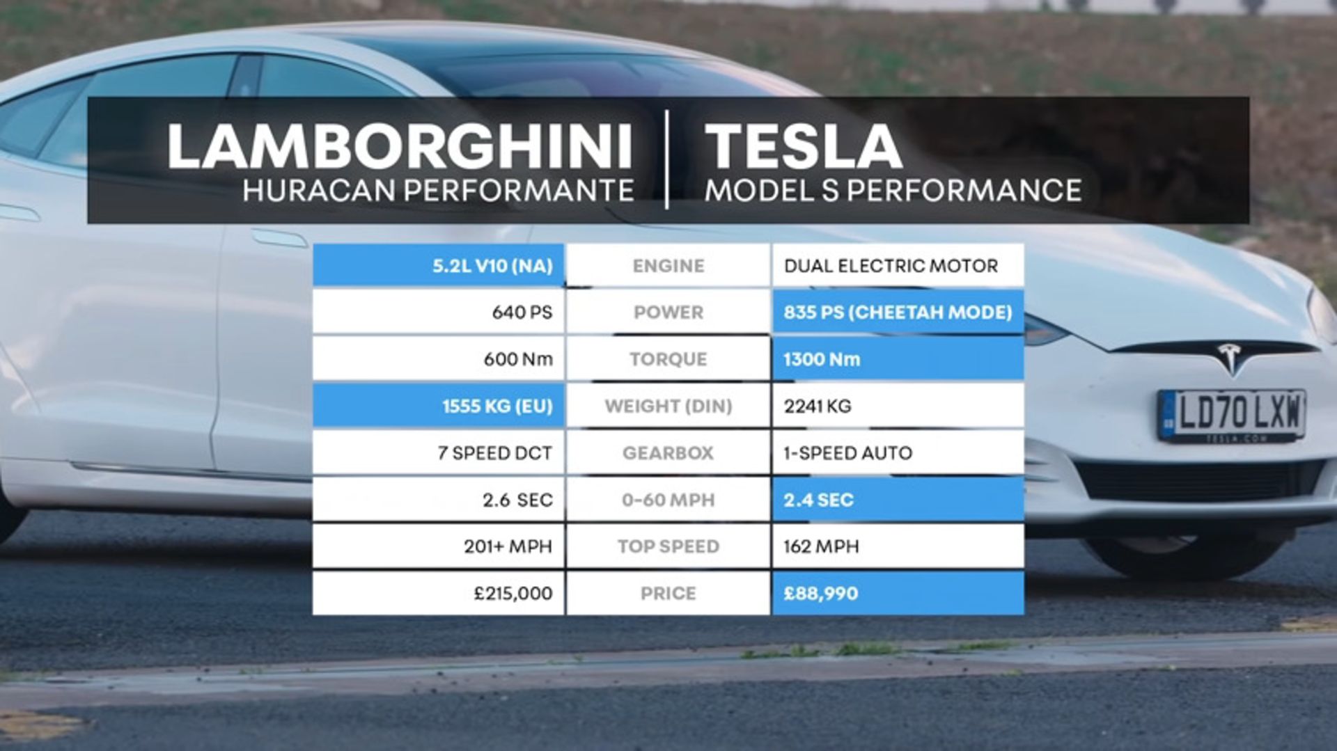 بدون تعجب باید گفت تسلا در ابتدای مسابقه اول که طی مسافت 400 متر است پیش میافتد. این خودرو لانچ بهتری داشته و قدرت بیشتر آن باعث میشود شکست دادنش کاری غیرممکن باشد. اما مدل S نمیتواند تا انتهای مسابقه برتری خود را حفظ کند و خیلی زود اوراکان آن را مغلوب میکند. در مسابقه دوم که رسیدن به سرعت 100 و سپس توقف کامل (0-100-0) است هم این لامبورگینی است که در نتیجهای کاملاً سورپرایز کننده بر رقیب خود غلبه میکند و نه تنها وزن بیشتر تسلا، بلکه ترمزها نیز در این نتیجه دخیل بودهاند.