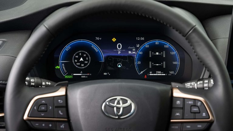 در مدلهای لیمیتد و پلاتینوم بجای صفحه آمپر دیجیتالی 7 اینچی استاندارد یک نمونهٔ بزرگتر 12.3 اینچی ارائه میشود که البته خیلی شلوغ است و نقشه، علائم جاده، سیستمهای ایمنی و... همگی صفحه آمپر را تا حد آزاردهندهای به هم میریزند. در تیپ پلاتینوم حداقل یک هدآپ دیسپلی اضافه میشود تا به کاهش بخشی از این حملهٔ بصری کمک کند. پکیج ایمنی Safety Sense 3.0 تویوتا در همهٔ تیپها بهصورت استاندارد ارائه میشود و شامل هشدار پیش از برخورد، کروز کنترل تطبیقی، دستیار علائم جاده و... میشود.