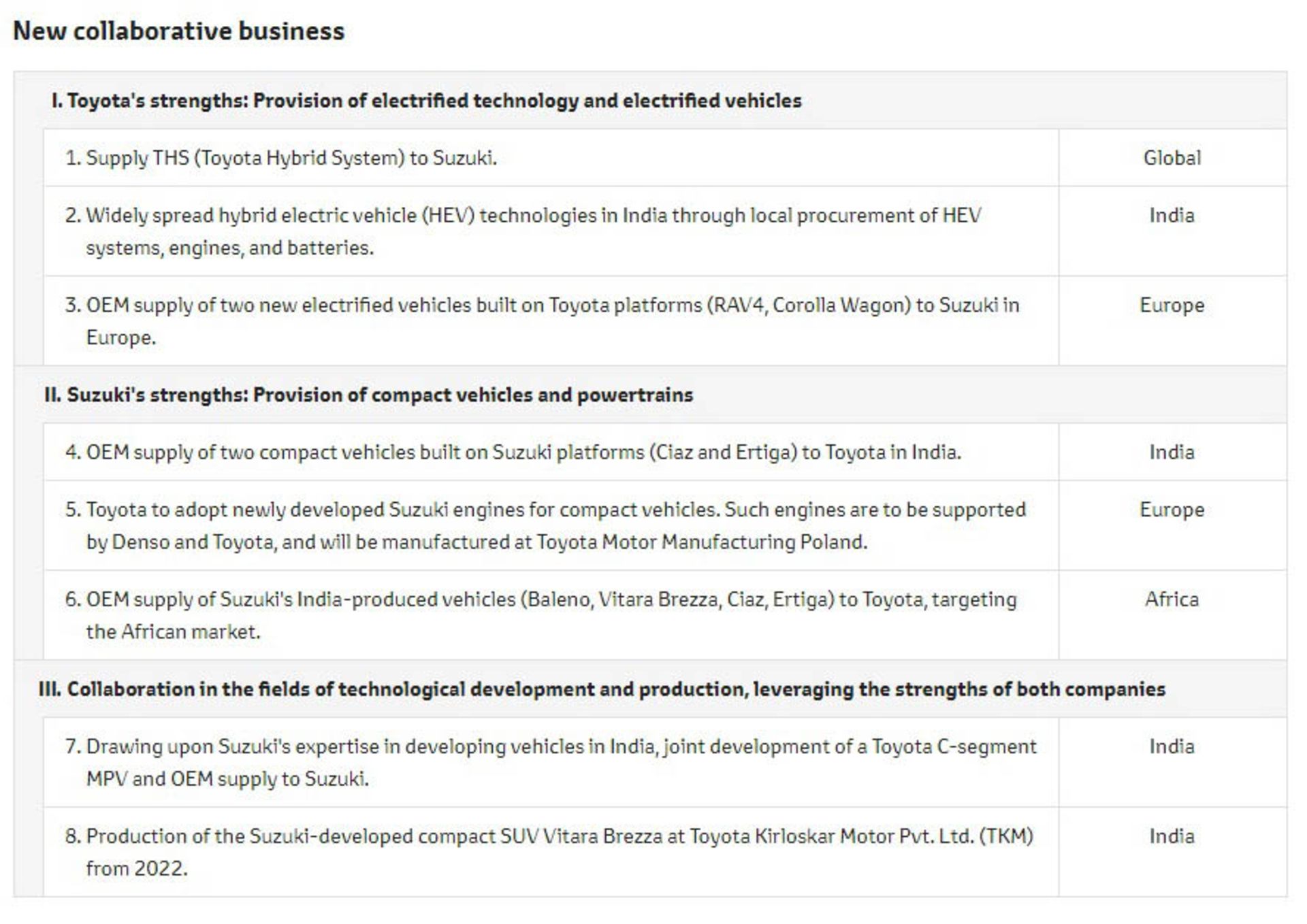 این دو شرکت که در سال 2017 پیش‌نویس توافقنامه‌ی همکاری باهم را امضا کرده بودند هم‌اکنون با جزئیات آن نیز موافقت نموده‌اند. تویوتا تخصص و تجربه‌ی خود در زمینه‌ی تکنولوژی‌های الکتریکی را به اشتراک خواهد گذاشت و سوزوکی هم تجارب به دست آمده از تولید خودروهای کامپکت را به تویوتا اعطا خواهد نمود.