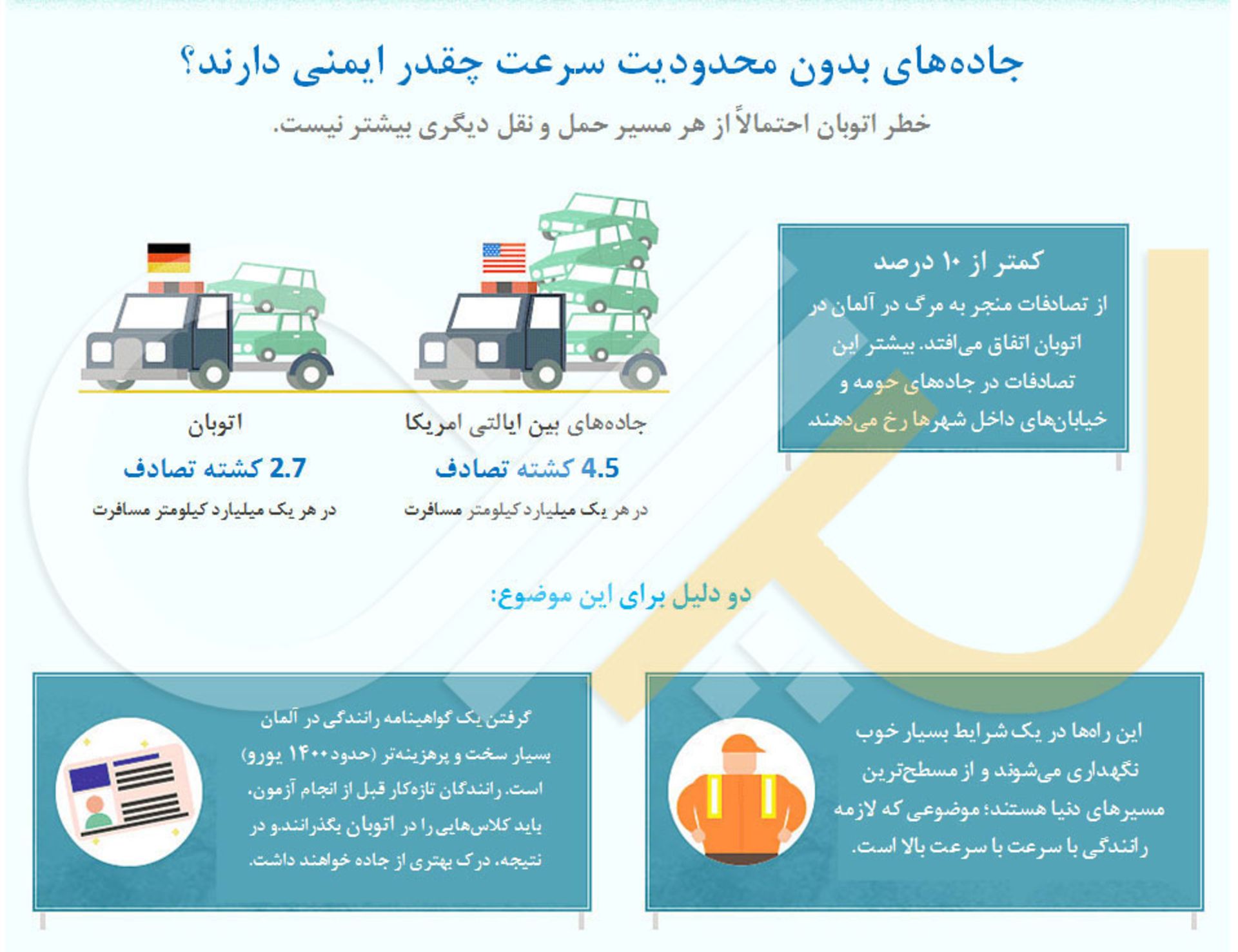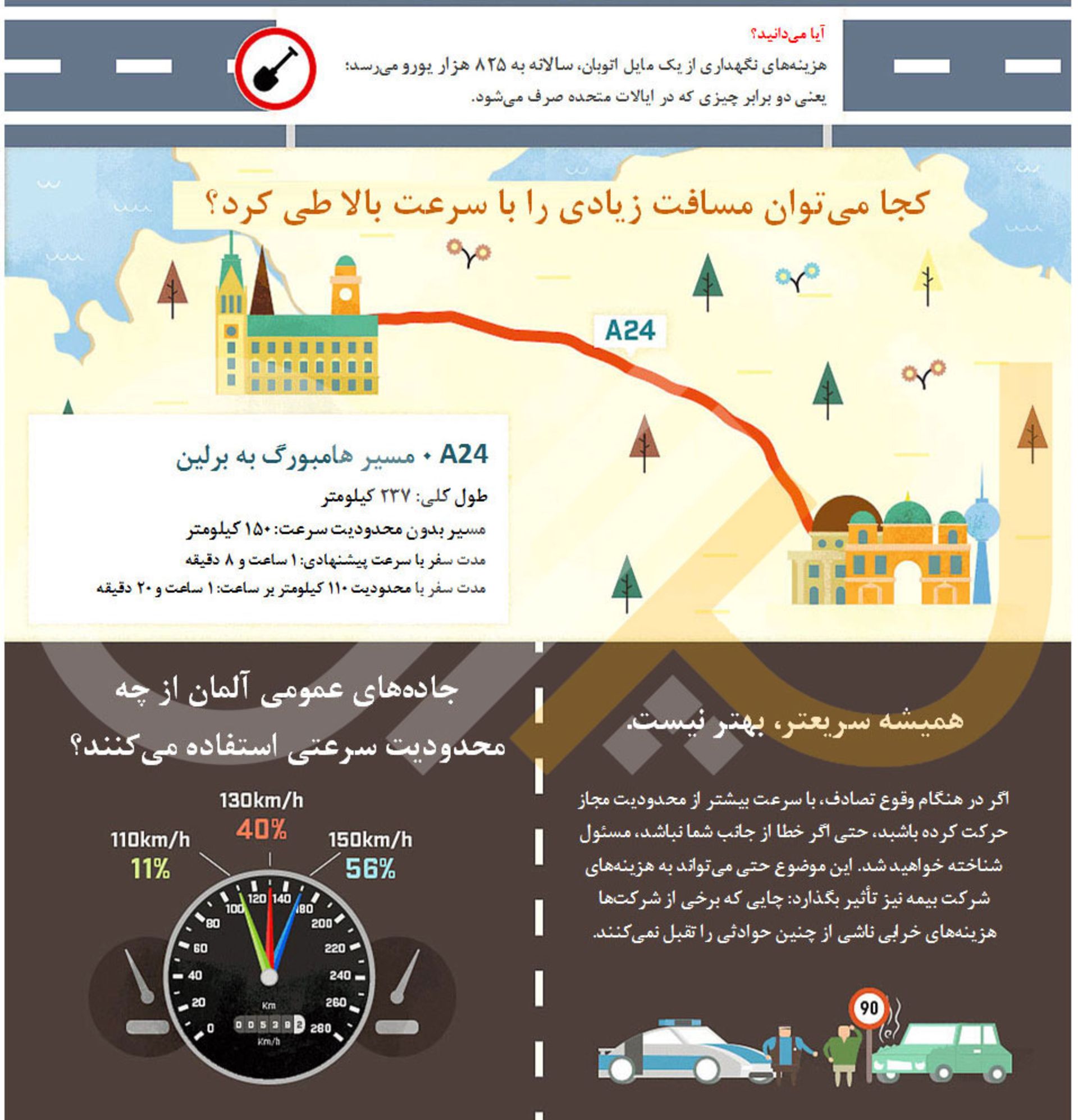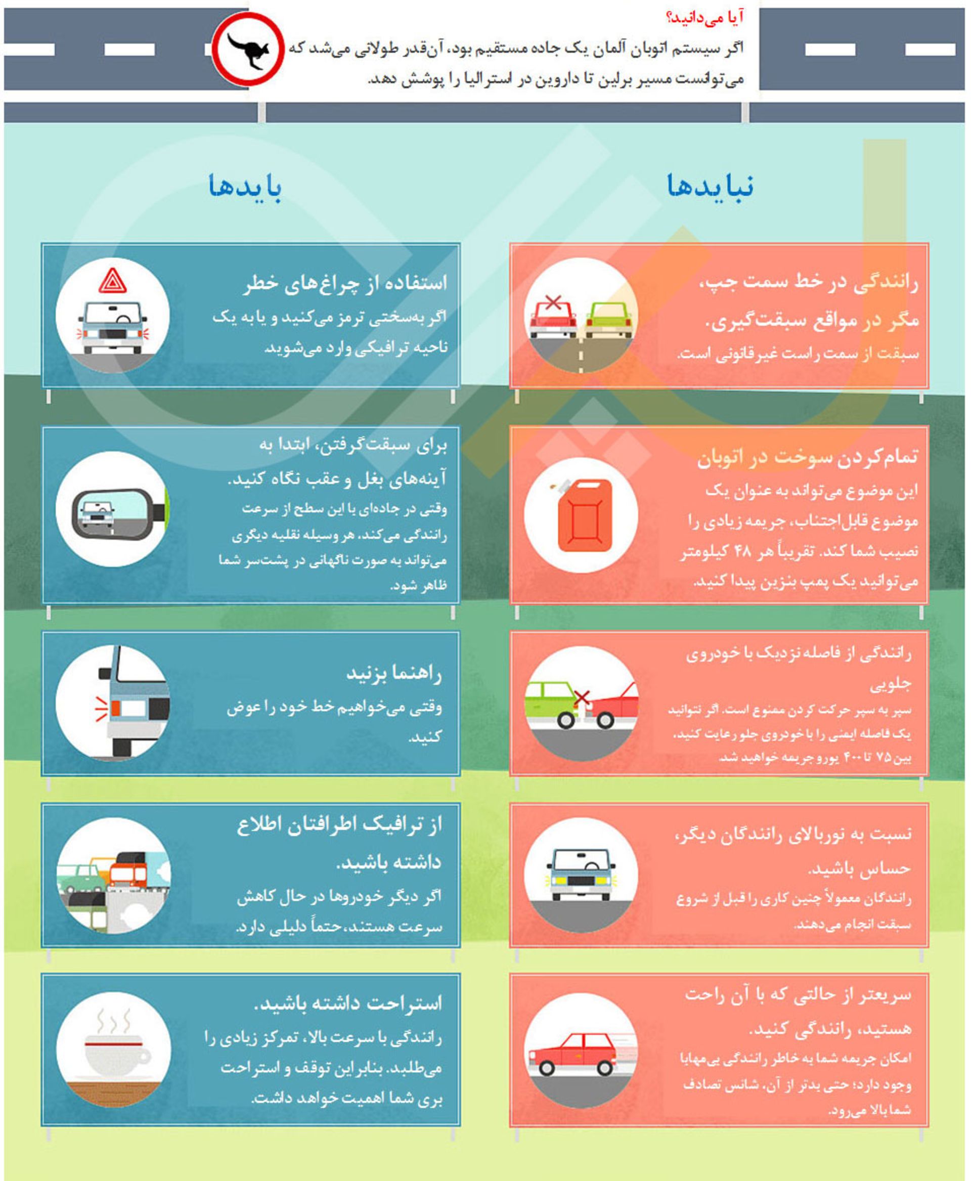 در هر صورت، رانندگی در هر کشوری، شرایط خاص خود را دارد و شما در قالب اینفوگرافی چگونگی رانندگی در «اتوبانهای» آلمان را مشاهده میکنید.