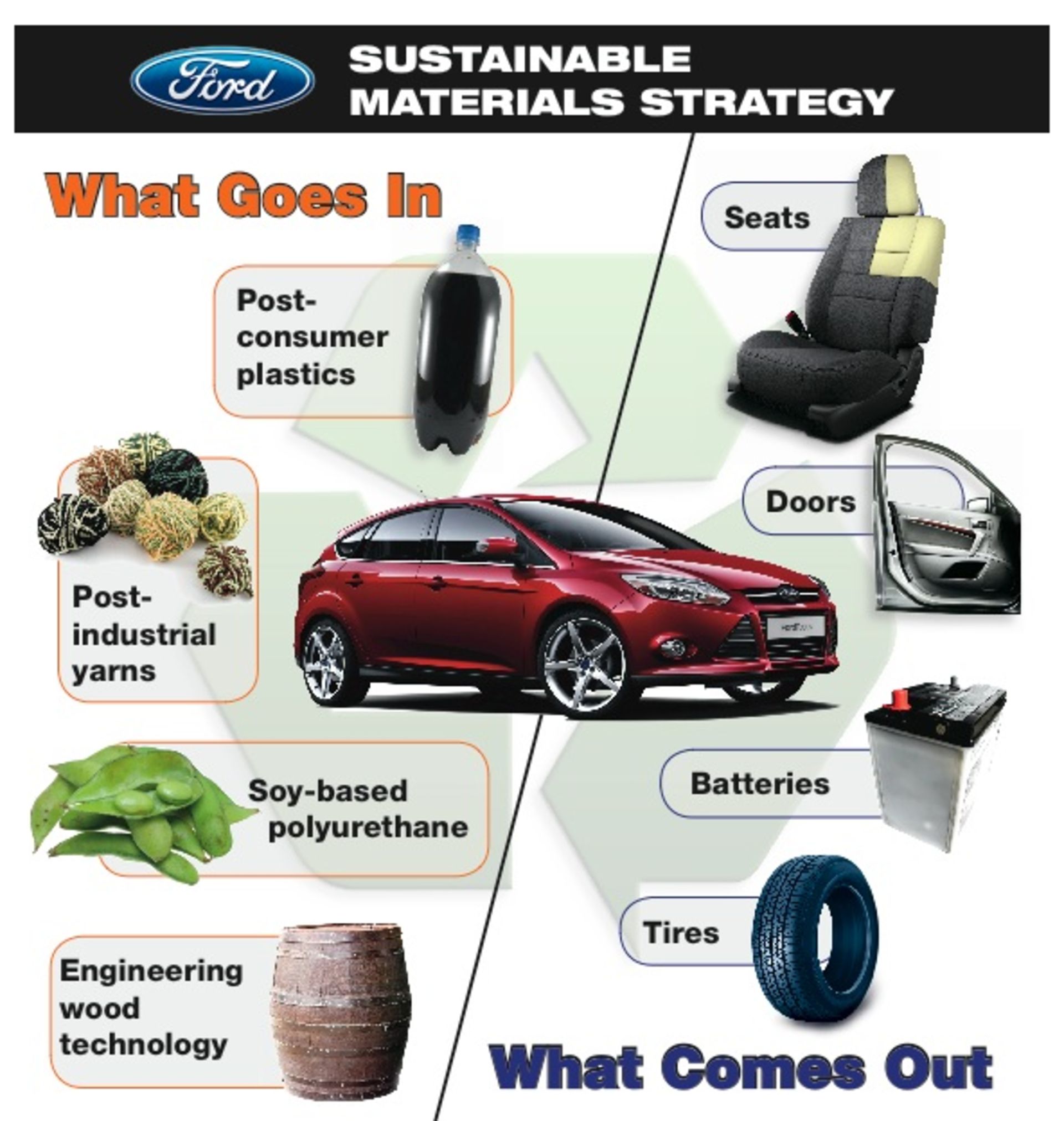 بطریهای آب موارد کاربرد فراوانی دارند. بسیاری از خودروهای فورد از جمله فیوژن، فوکوس و F0150 از این مواد در صندلیهای خود سود بردهاند. طبق گفتههای فورد تقریباً 22 بطری پلاستیک برای ساخت صندلی فوکوس بکار رفته است. این تعداد برای صندلیهای فیوژن S 39 بطری است. بین 63 تا 110 بطری نیز بسته به مدل خودرو در ساخت صندلی فورد F-150 بکار رفته است. باید گفت که فوم بالشتک صندلی نیز از سویا ساخته میشود.