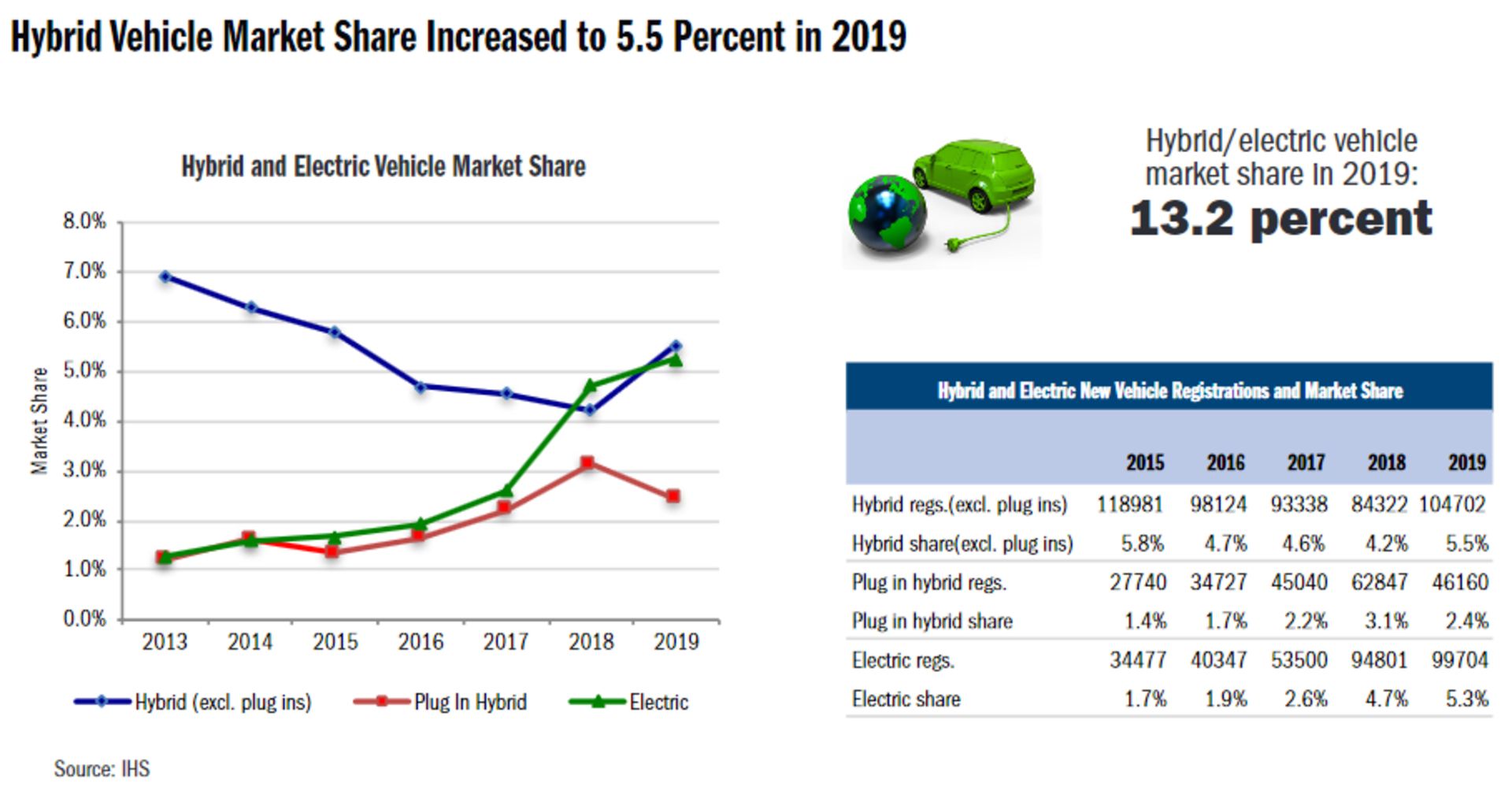 بنا به گفته انجمن نمایندگان خودروهای جدید کالیفرنیا، فروش خودروهای پلاگین در سال پیش با افت 7.5 درصدی به 145864 دستگاه رسیده که سهم 7.7 درصدی از کل بازار را تشکیل میدهد. سهم کلی خودروهای هیبریدی، پلاگین هیبریدی و الکتریکی از بازار این ایالت برابر با 13.2 درصد میباشد.