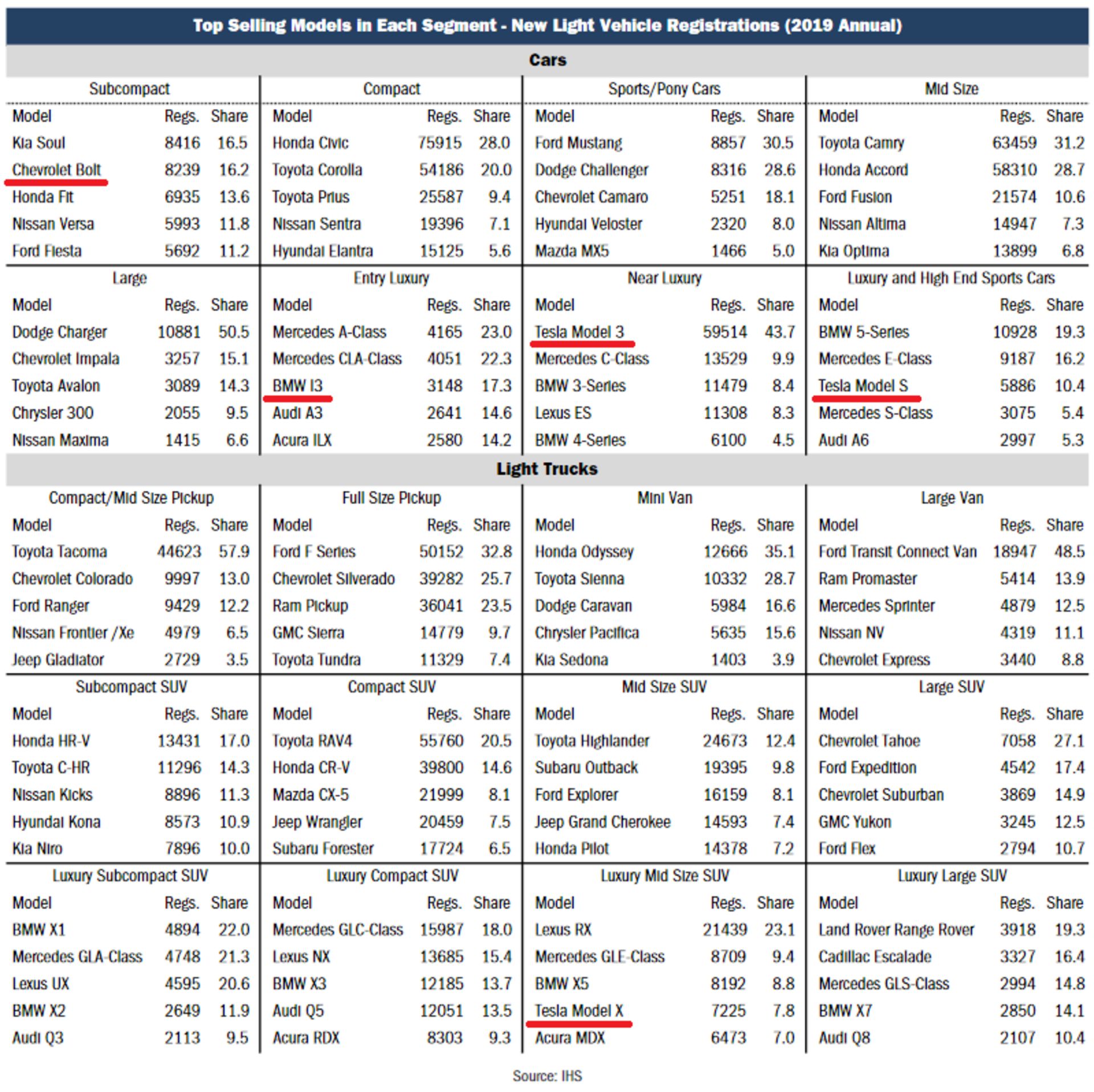5 خودروی الکتریکی پرفروش در کلاسهای گوناگون به شرح زیر هستند: