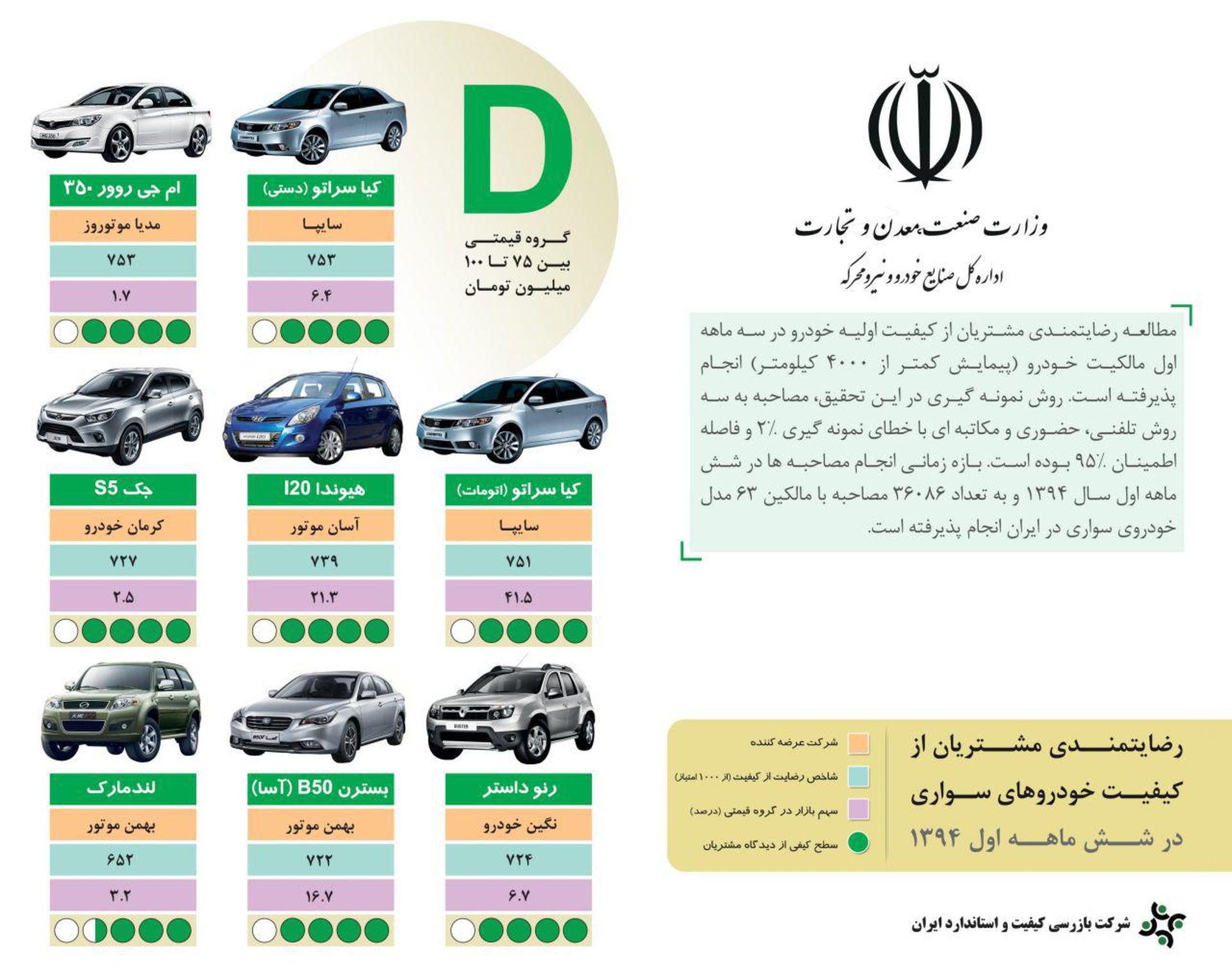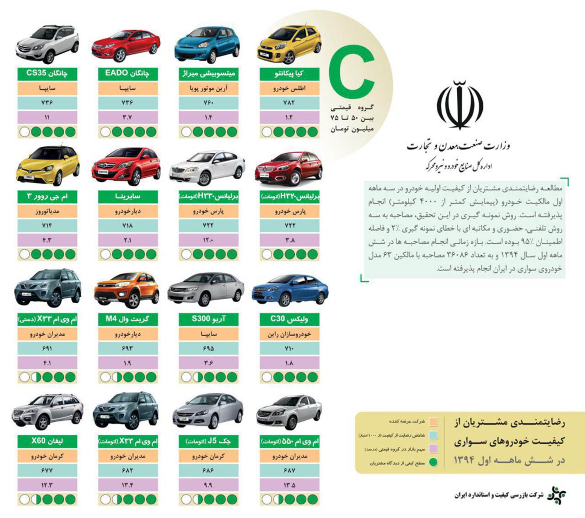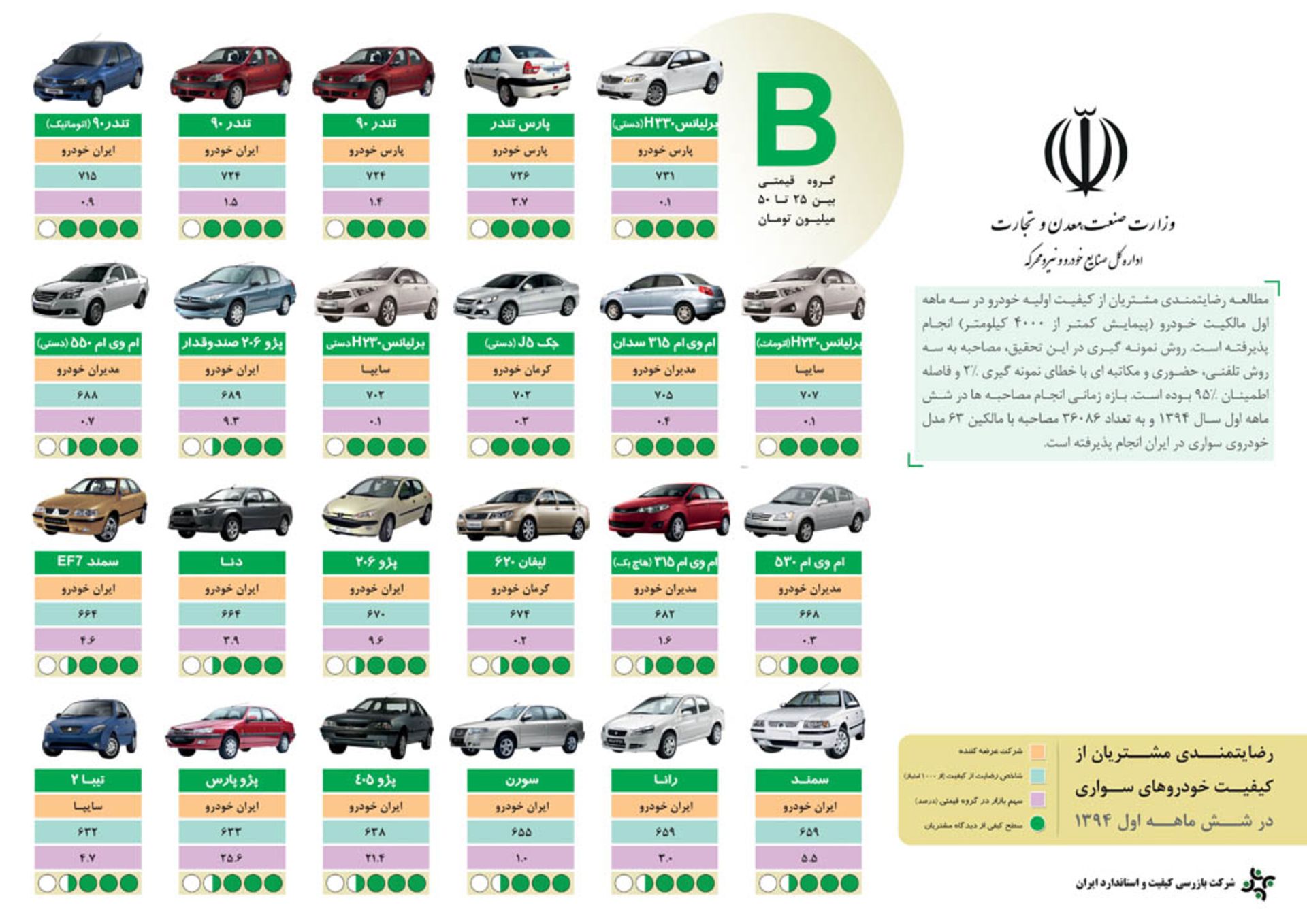 برای کسانی که می‌توانند بین 25 تا 50 میلیون برای خودرو هزینه کنند، انبوهی از خودروهای وطنی و چینی مهیاست. در این میان خودروی نورسیده برلیانس h330 گیربکس دستی با امتیاز 731 بالاتر از پارس تندر 726 امتیازی و L90 های 724 امتیازی قرار گرفت. پایین‌ترین امتیازات، به تیبا 2، پژو پارس، پژو 405 و سورن تعلق گرفت. محصولات ایران‌خودرو، در زمینه جمع‌آوری میزان رضایت مشتریان در کف جدول قرار گرفتند.