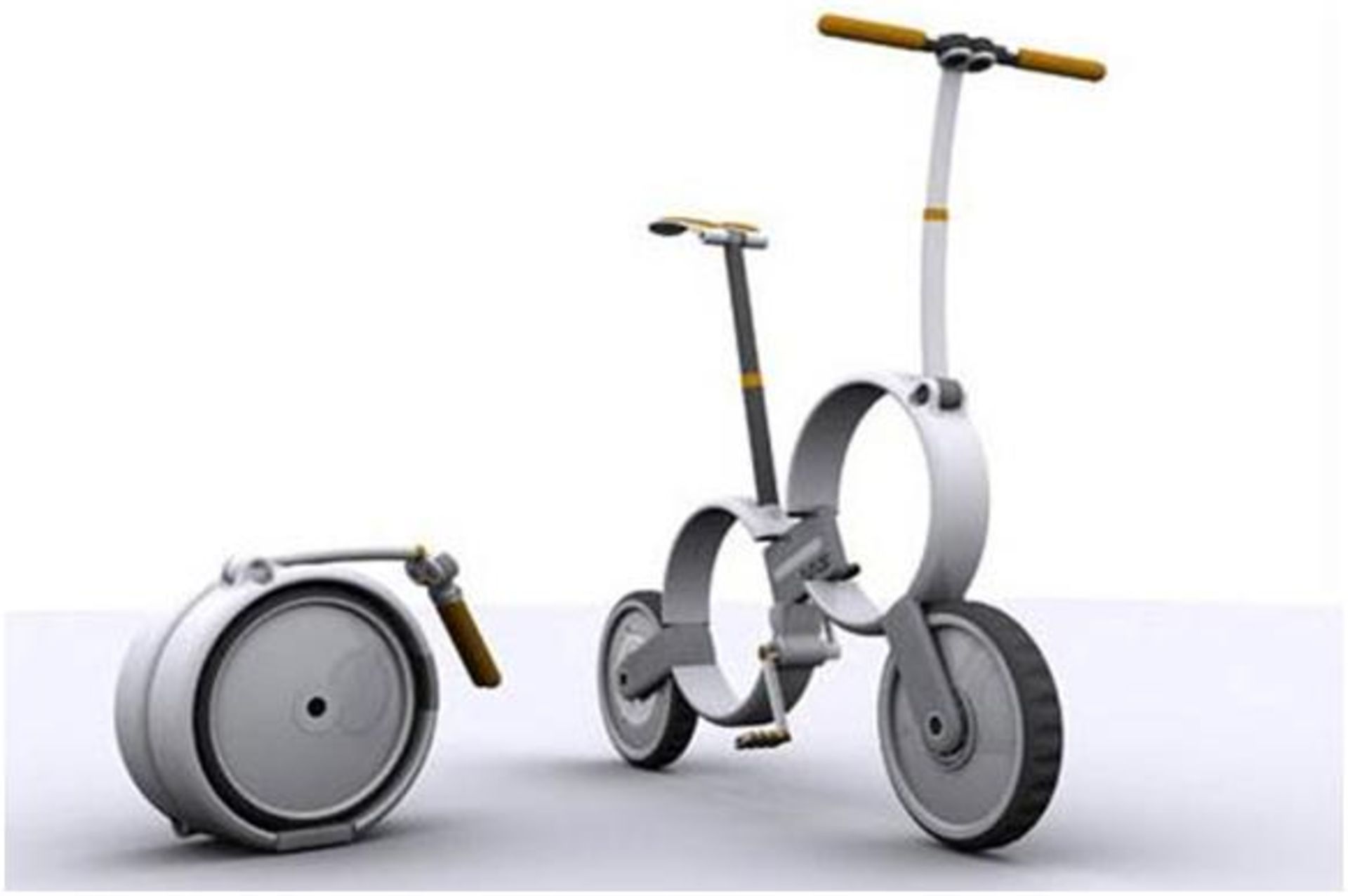 این دوچرخه تاشو هم طوری ساخته شده که همه قسمتهای دایره ای در همدیگر جمع شده و فضای کمی اشغال می کنند.