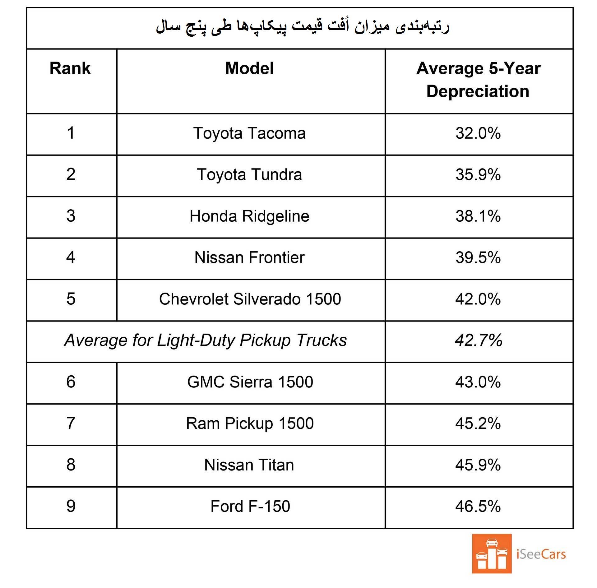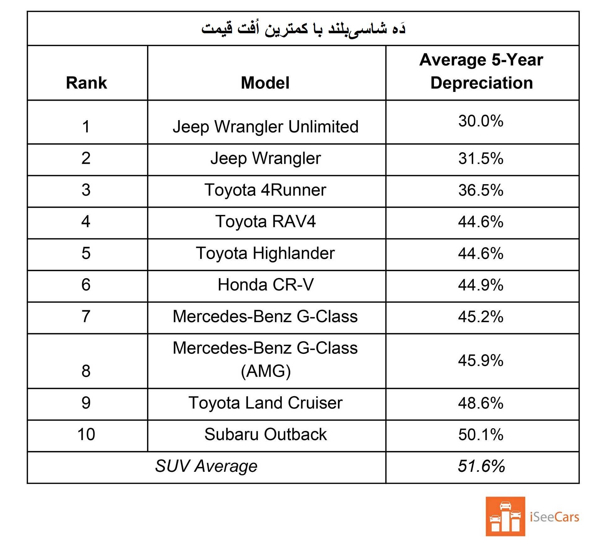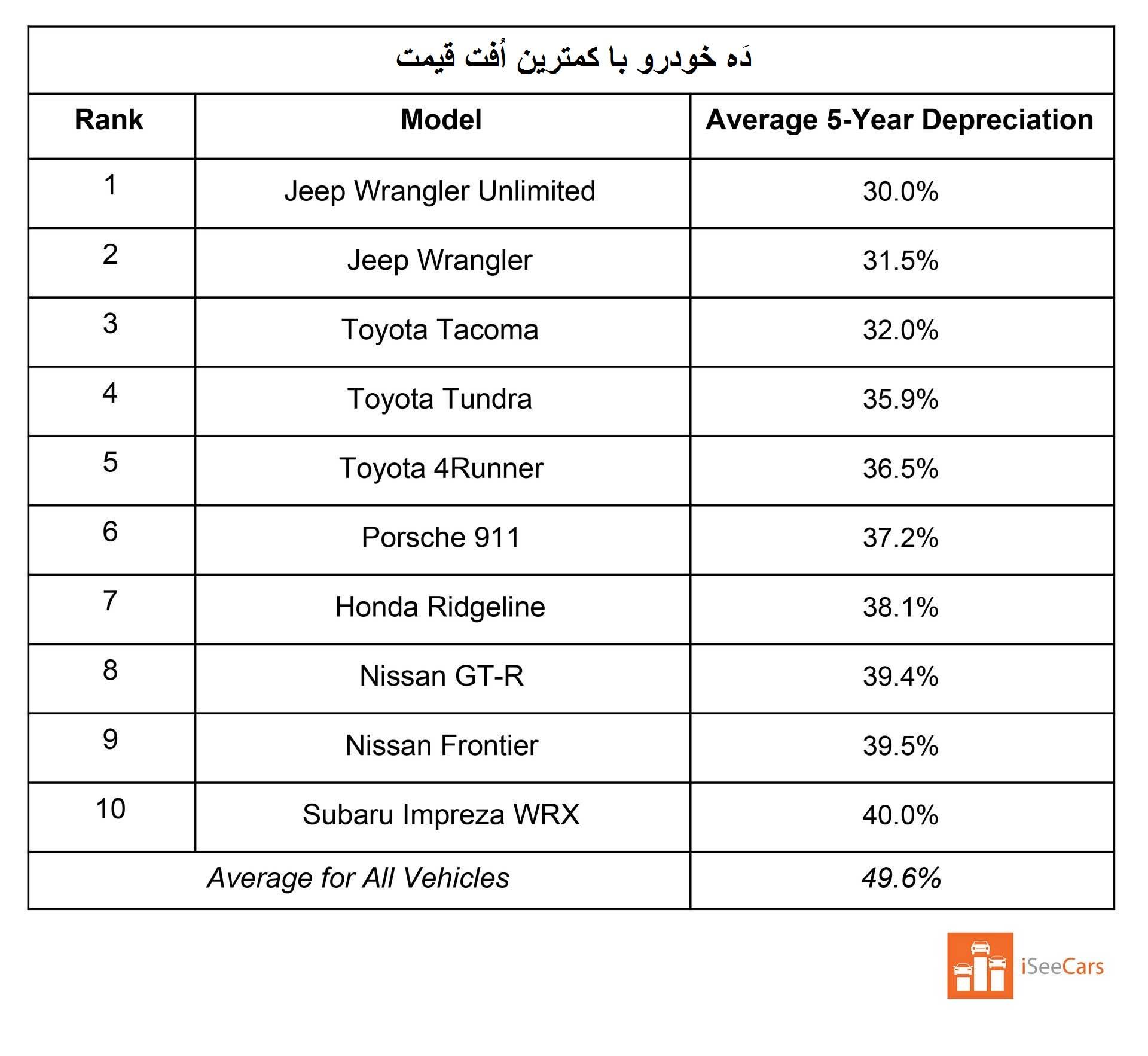با توجه به محبوبیت پیکاپها و شاسیبلندها، چندان تعجبآور نیست که بسیاری از این خودروها افت قیمت کمی دارند. در صدر لیست کماستهلاکترین خودروها، نسل قبلی جیپ رانگلر در هر دو نسخهٔ معمولی و آنلیمیتد (چهاردر) قرار گرفته است که بعد از پنج سال تنها 31.5 و 30 درصد از ارزش اولیهٔ خود را از دست میدهند. در این لیست تویوتا هم با مدلهای تاکوما (32 درصد افت قیمت)، تاندرا (35.9 درصد افت قیمت) و فورانر (36.5 درصد افت قیمت) رتبههای سوم تا پنجم را در اختیار دارد که هر سه مقدار زیادی از ارزش اولیهٔ خود را بعد از پنج سال حفظ میکنند. پورشه 911 با 37.2 درصد، نیسان GT-R با 39.4 درصد و سوبارو ایمپرزا WRX با 40 درصد افت قیمت نیز کماستهلاکترین خودروهای عملکرد بالا محسوب میشوند.