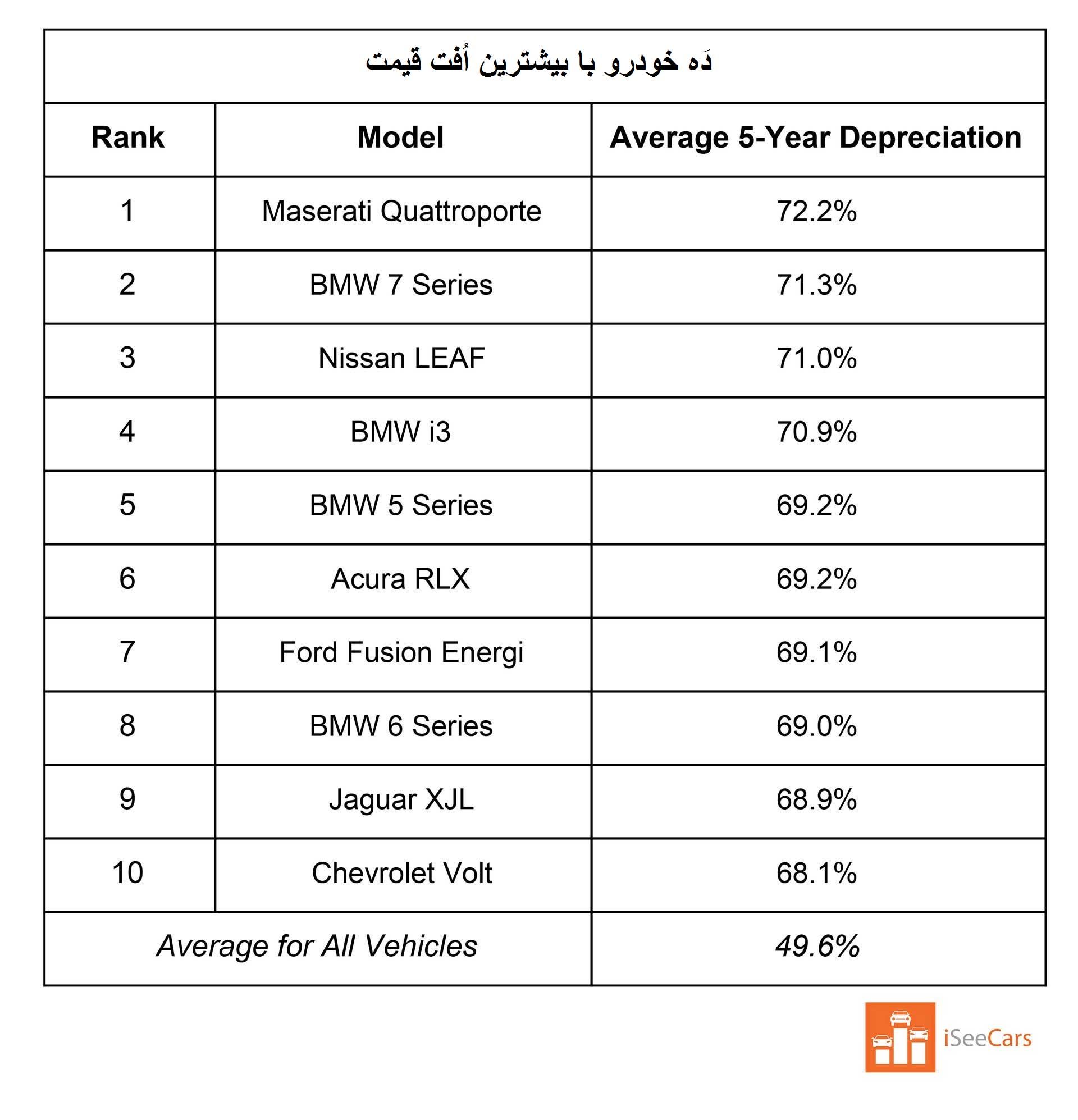 از سوی دیگر، پراستهلاکترین خودروها فقط به دو دستهٔ لوکس و دوستدار محیطزیست تقسیم میشوند. مازراتی کواتروپورته بدترین وضعیت را دارد زیرا پس از گذشت پنج سال 72.2 درصد از ارزش اولیهٔ خود را از دست میدهد که 22.6 درصد از حد متوسط بیشتر است. بامو سری 7 هم اوضاع بهتری ندارد زیرا آنهم ظرف پنج سال 71.3 درصد از ارزش خود را از دست میدهد. آکورا RLX با 69.2 درصد و جگوار XJL با 68.9 درصد اُفت قیمت نیز دیگر سدانهای پرچمدار پراستهلاک هستند. در بخش خودروهای دوستدار محیطزیست، نیسان لیف و بامو i3 به ترتیب با 71 و 70.9 درصد، بیشترین اُفت قیمت را دارند. بعد از این دو هاچبک الکتریکی نیز سدانهای هیبریدی فورد فیوژن انرژی با 69.1 درصد و شورلت ولت با 68.1 درصد اُفت قیمت، در لیست پراستهلاکترین خودروها قرار گرفتهاند.