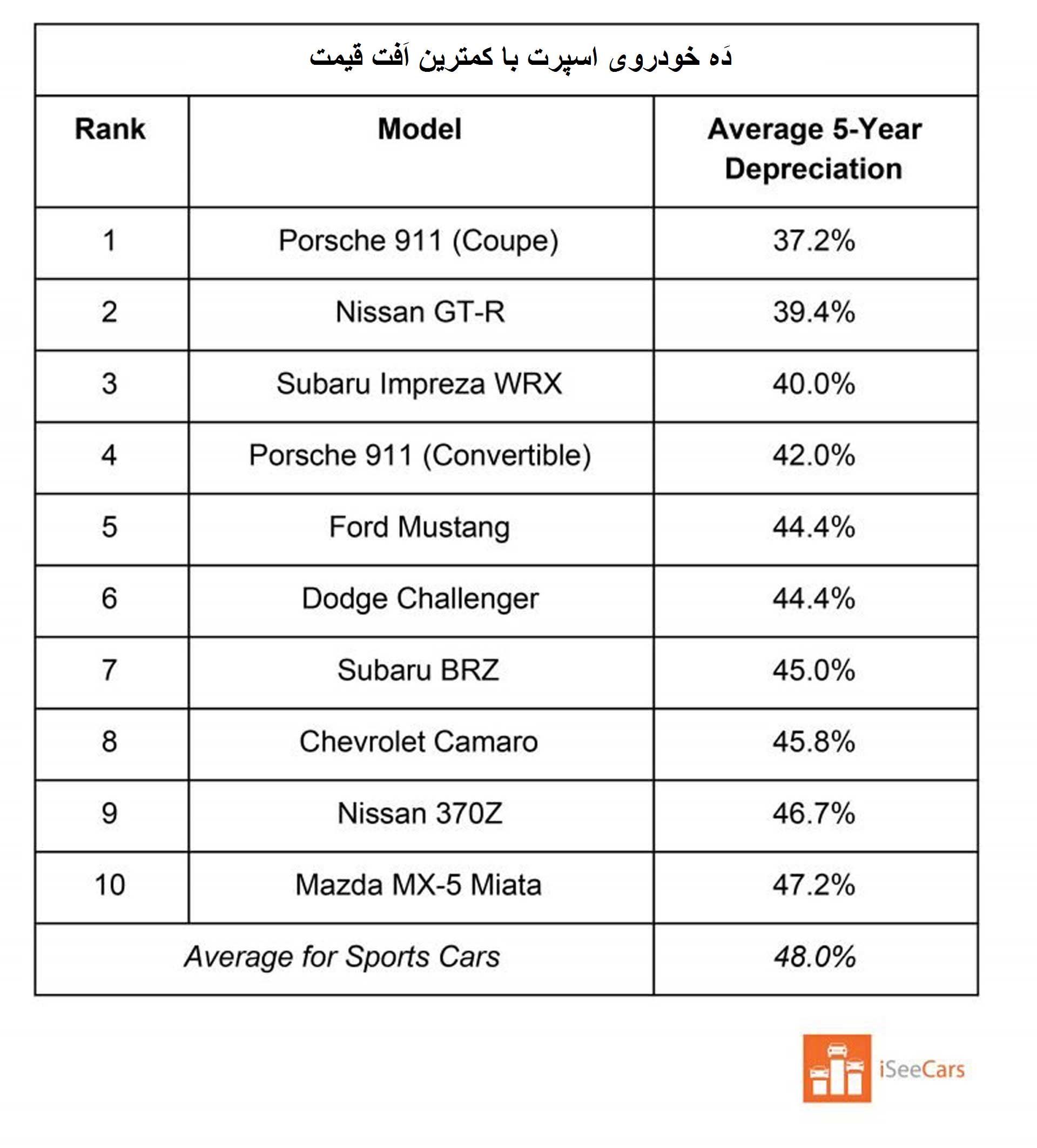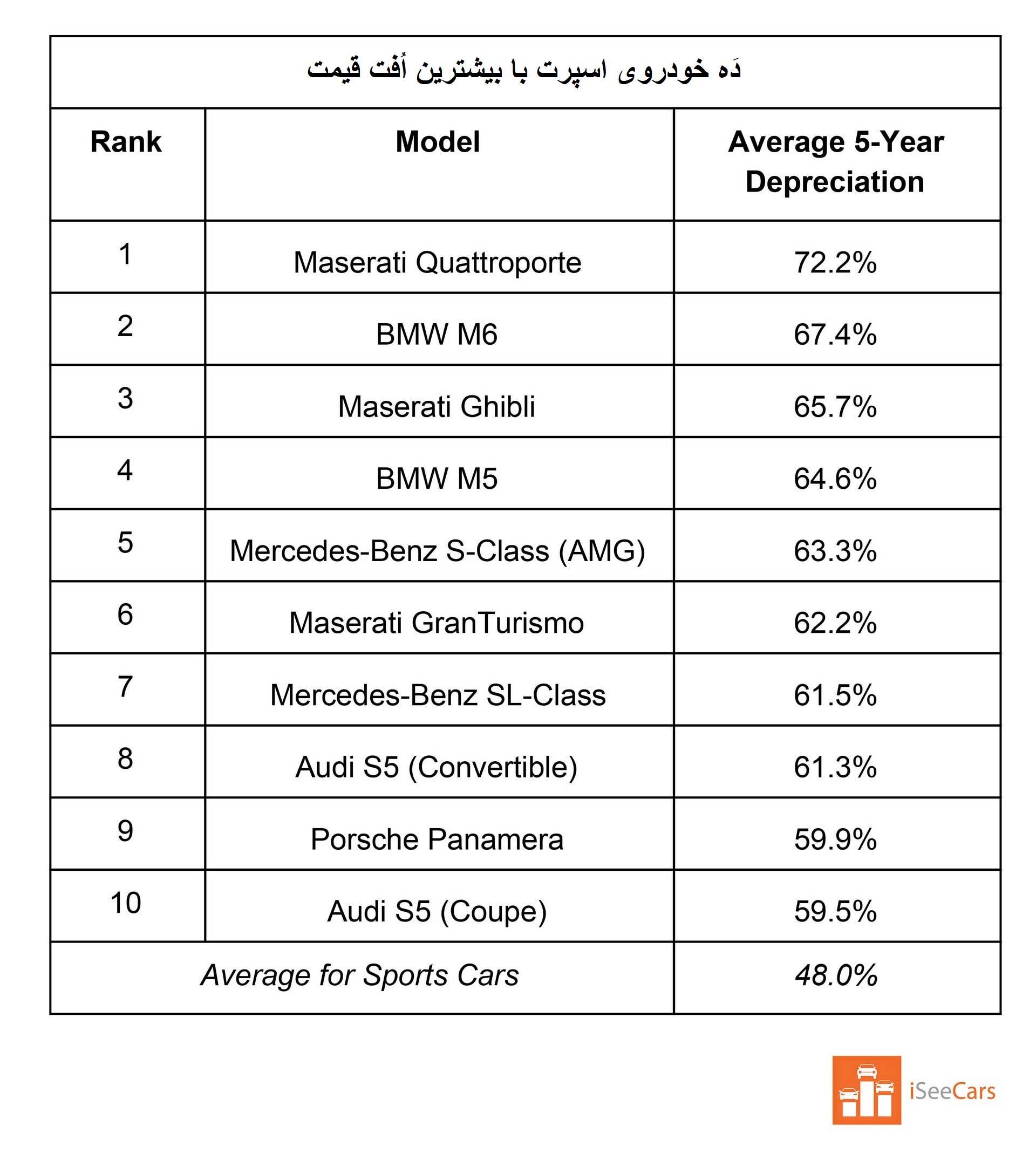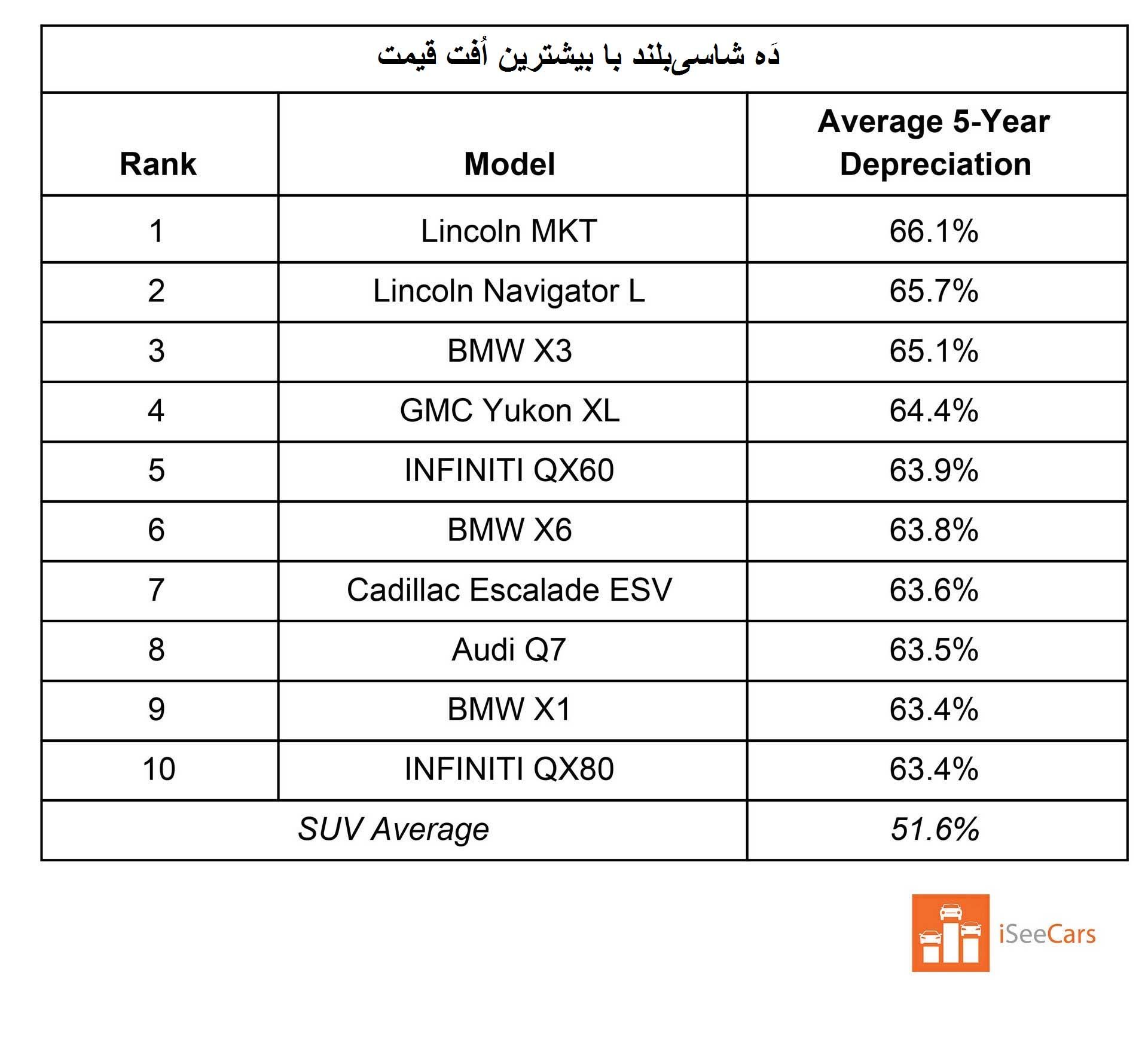 در این مطالعه اما iSeeCars غیر از اینکه بهطورکلی پراستهلاکترین و کماستهلاکترین خودروها را مشخص کرده، بهطور خاص لیست پراستهلاکترین و کماستهلاکترین شاسیبلندها، پیکاپها و خودروهای اسپرت را هم منتشر کرده است که میتوانید آنها را در جداول زیر مشاهده کنید. خریداران زرنگ میتوانند از این اطلاعات برای انتخاب خودروی جدید خود استفاده کنند تا پس از پنج سال استفاده، کمترین ضرر و اُفت قیمت را تجربه کنند. از سوی دیگر، خریداران خودروهای دستدوم نیز در صورت انتخاب خودروهایی که بیشترین اُفت قیمت را داشتهاند میتوانند معاملهٔ خوبی داشته باشند.