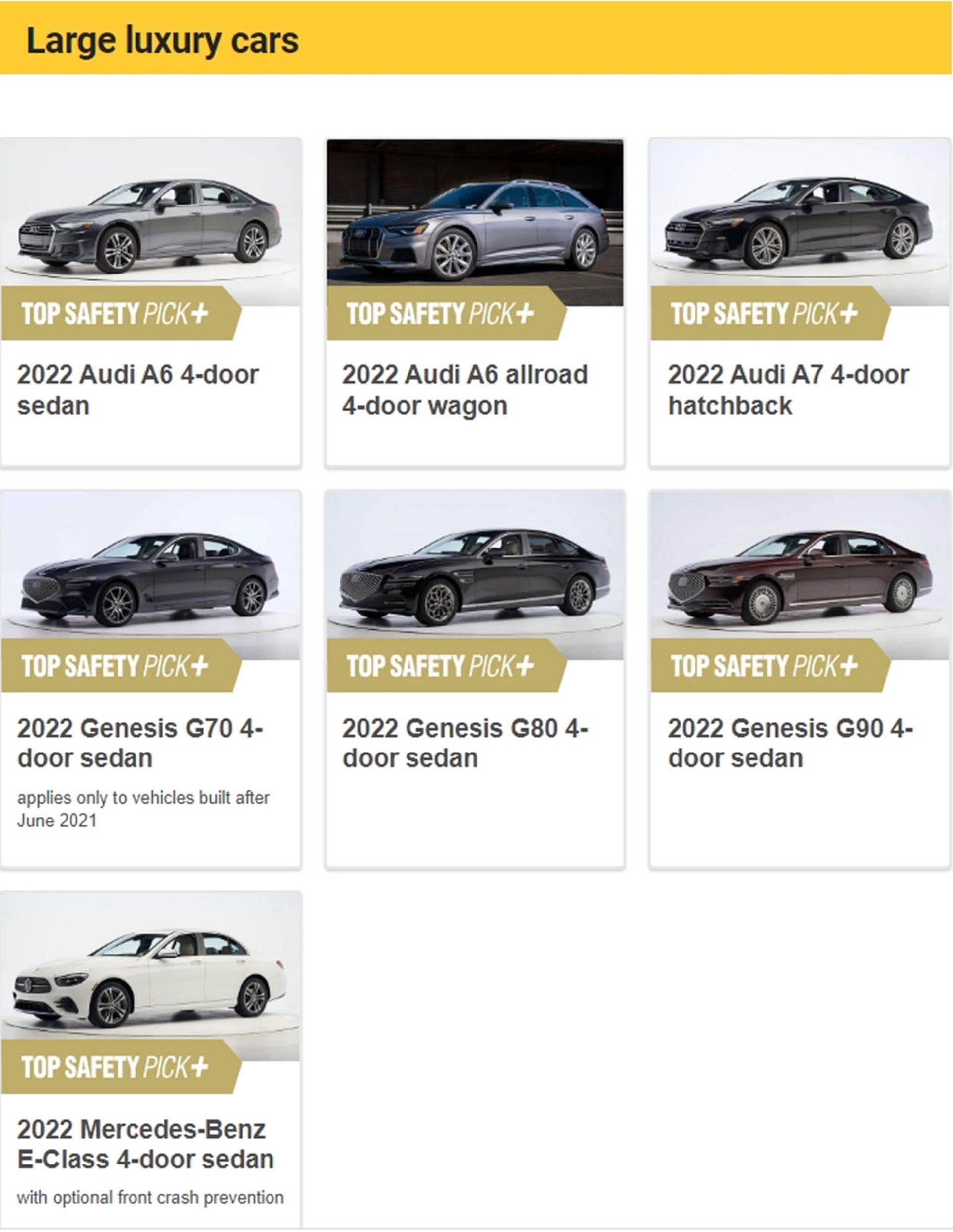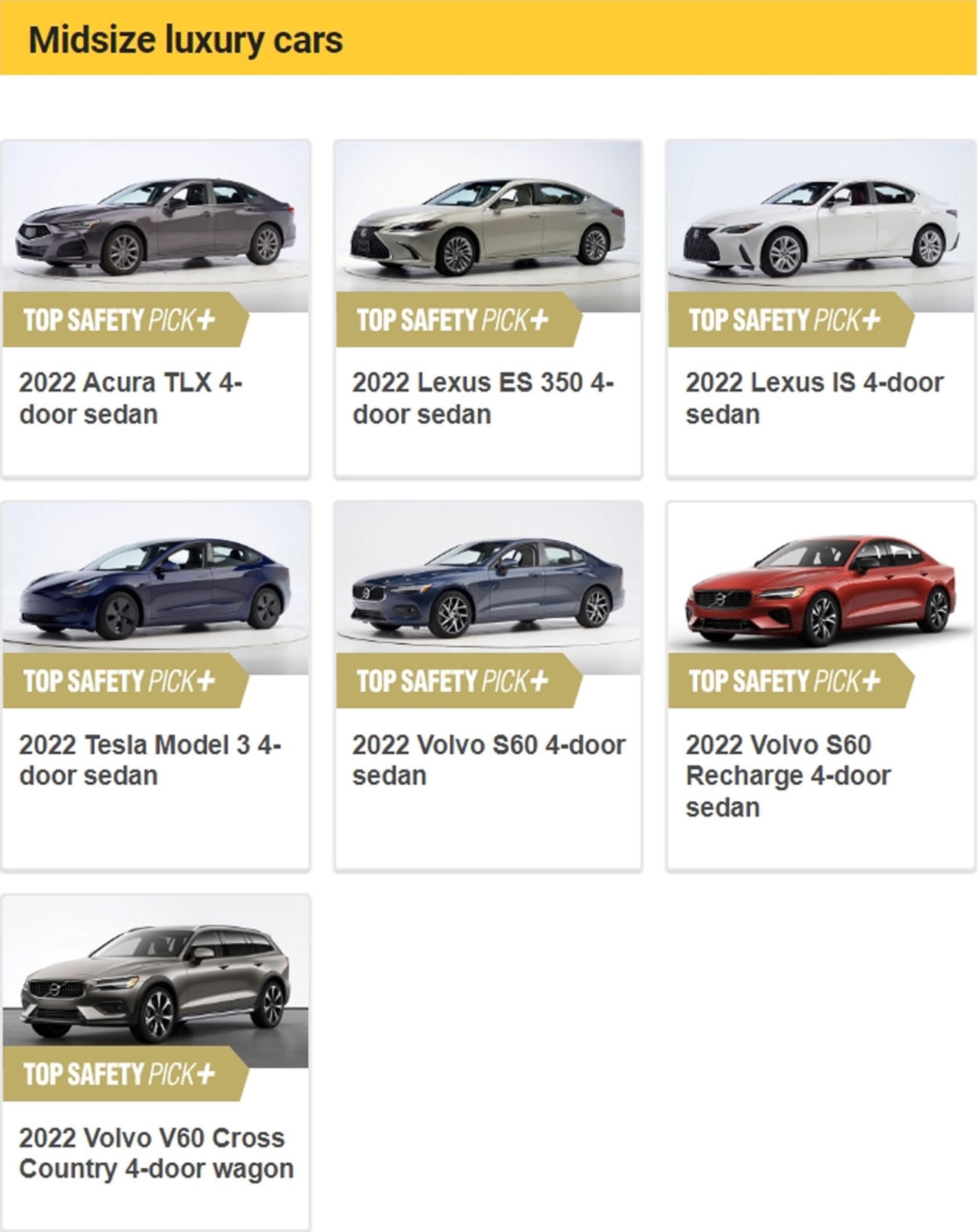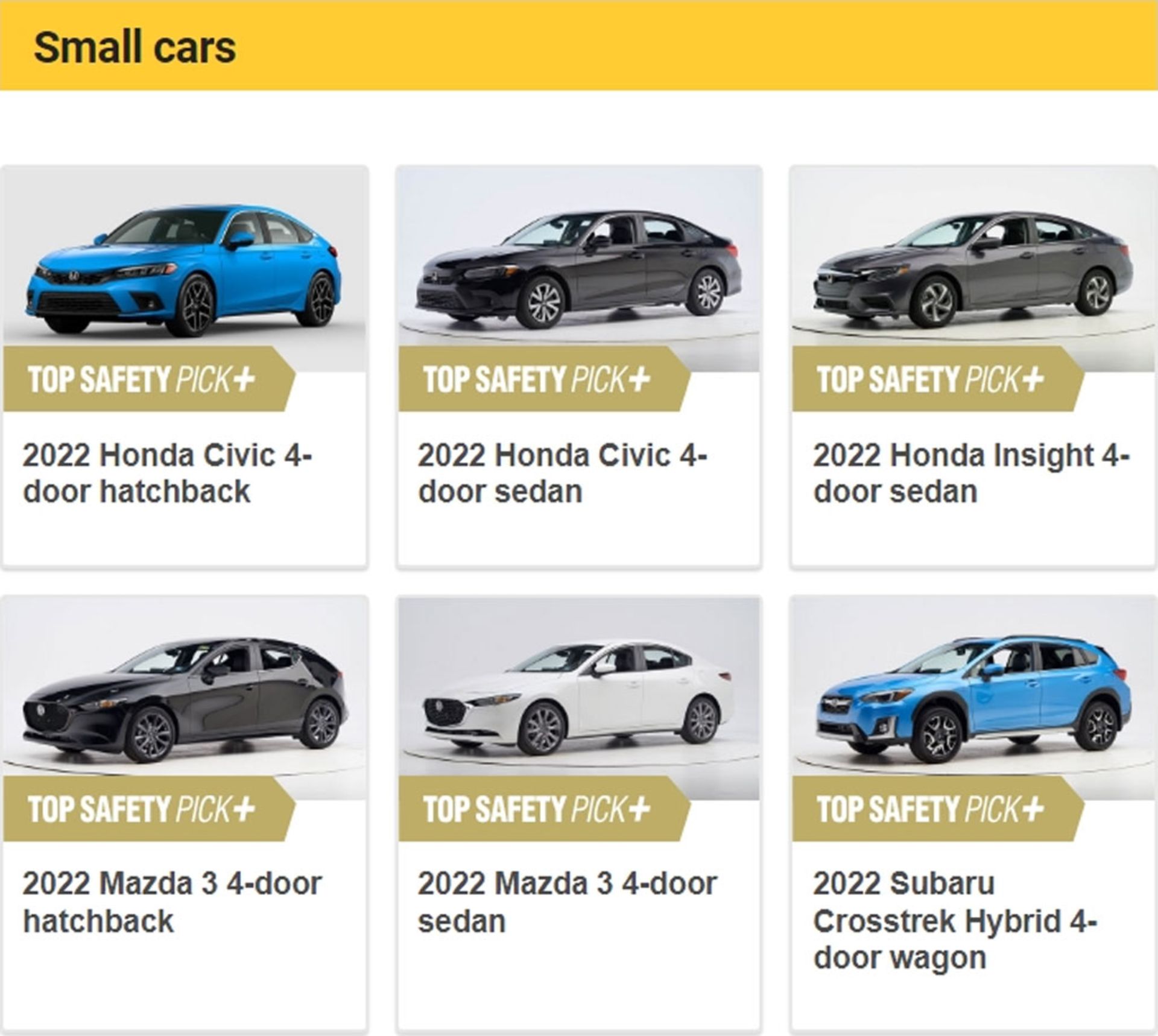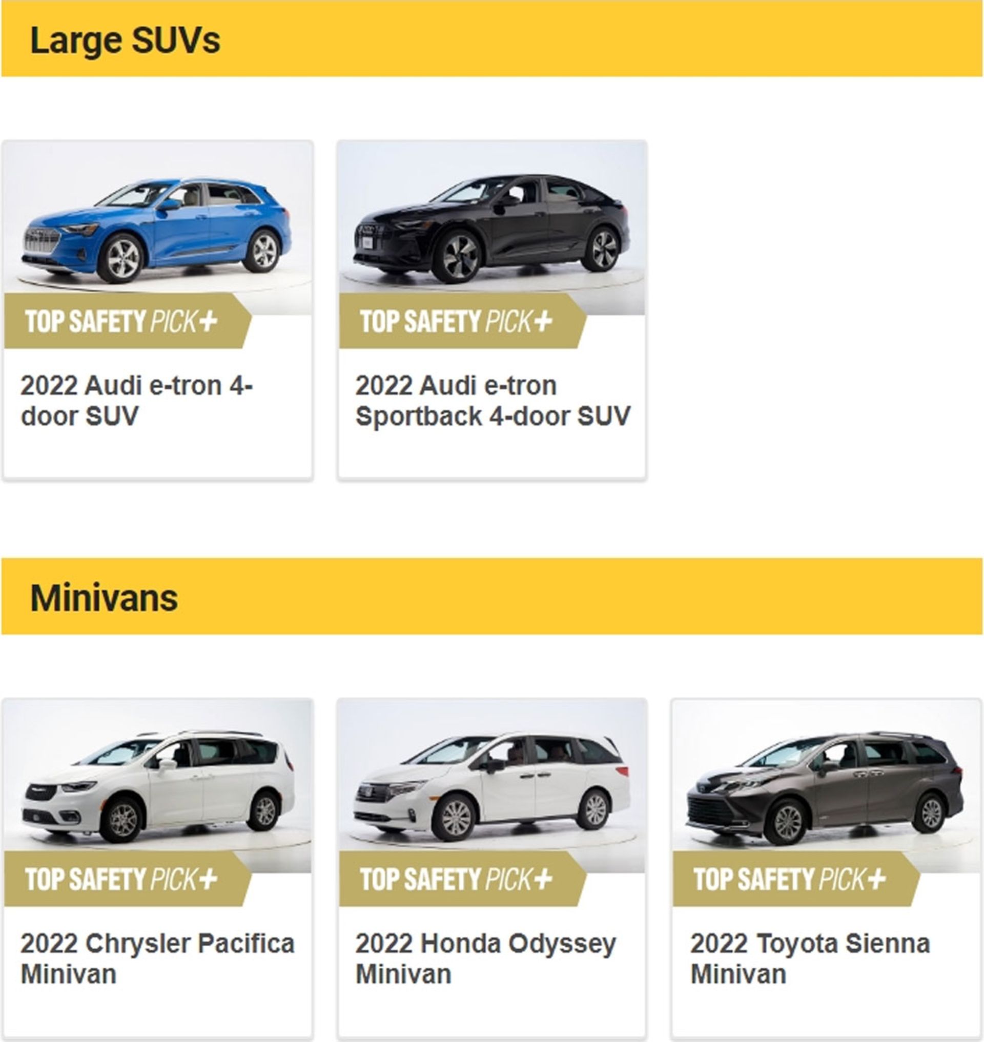 موسسهٔ بیمه برای ایمنی بزرگراهها یا IIHS لیست ایمنترین خودروهای سال 2022 را در قالب جوایز Top Safety Pick و Top Safety Pick+ معرفی کرده است. امسال 65 خودرو موفق به کسب جایزهٔ TSP+ شدهاند و 36 خودرو هم جایزهٔ کمی پایینتر TSP را کسب کردهاند. این یعنی شرایط ایمنی خودروها نسبت به سال 2021 بهبود پیدا کرده است زیرا در این سال 49 خودرو توانستند جایزهٔ TSP+ و 41 خودرو جایزهٔ TSP را از آن خود کنند.
