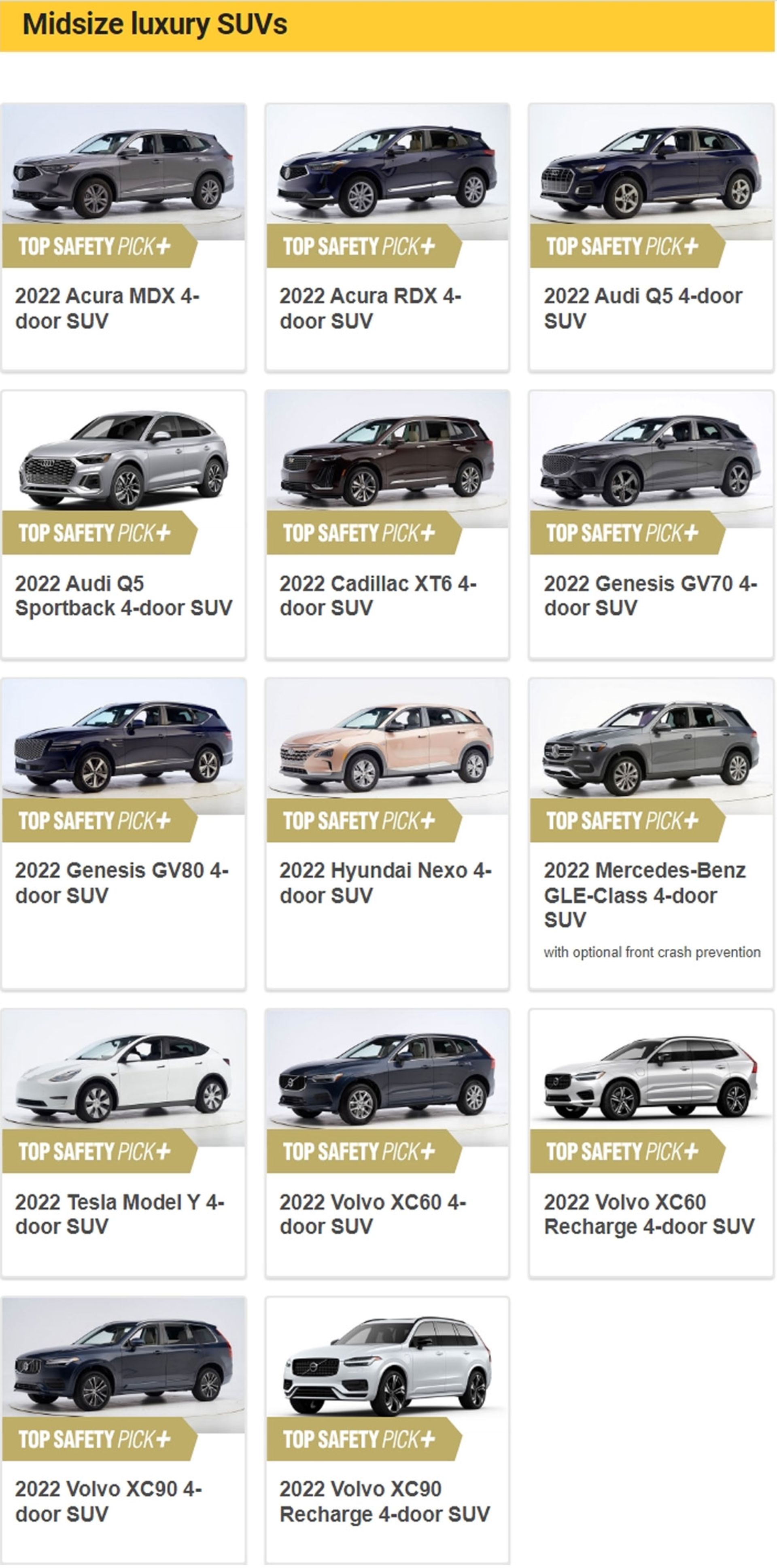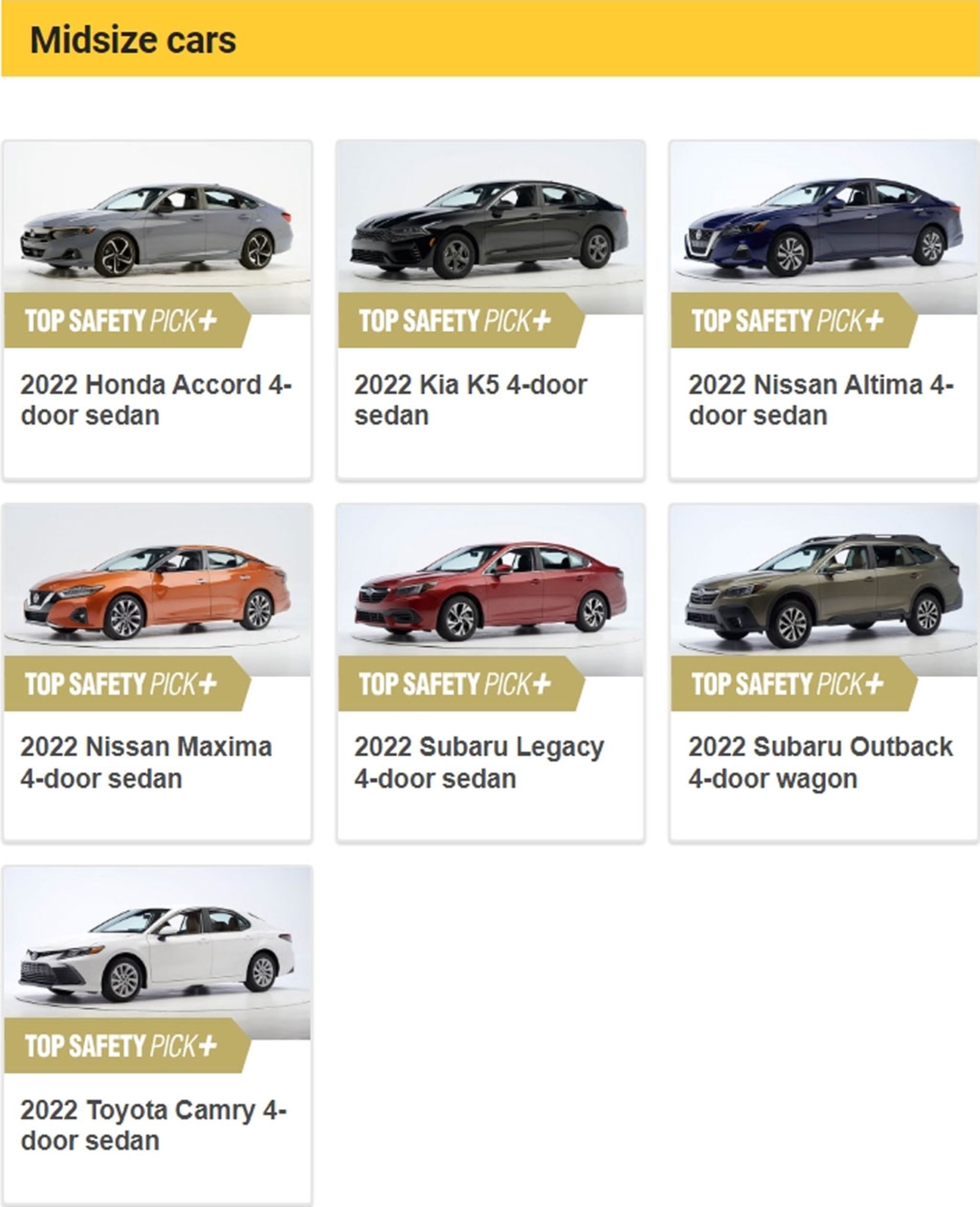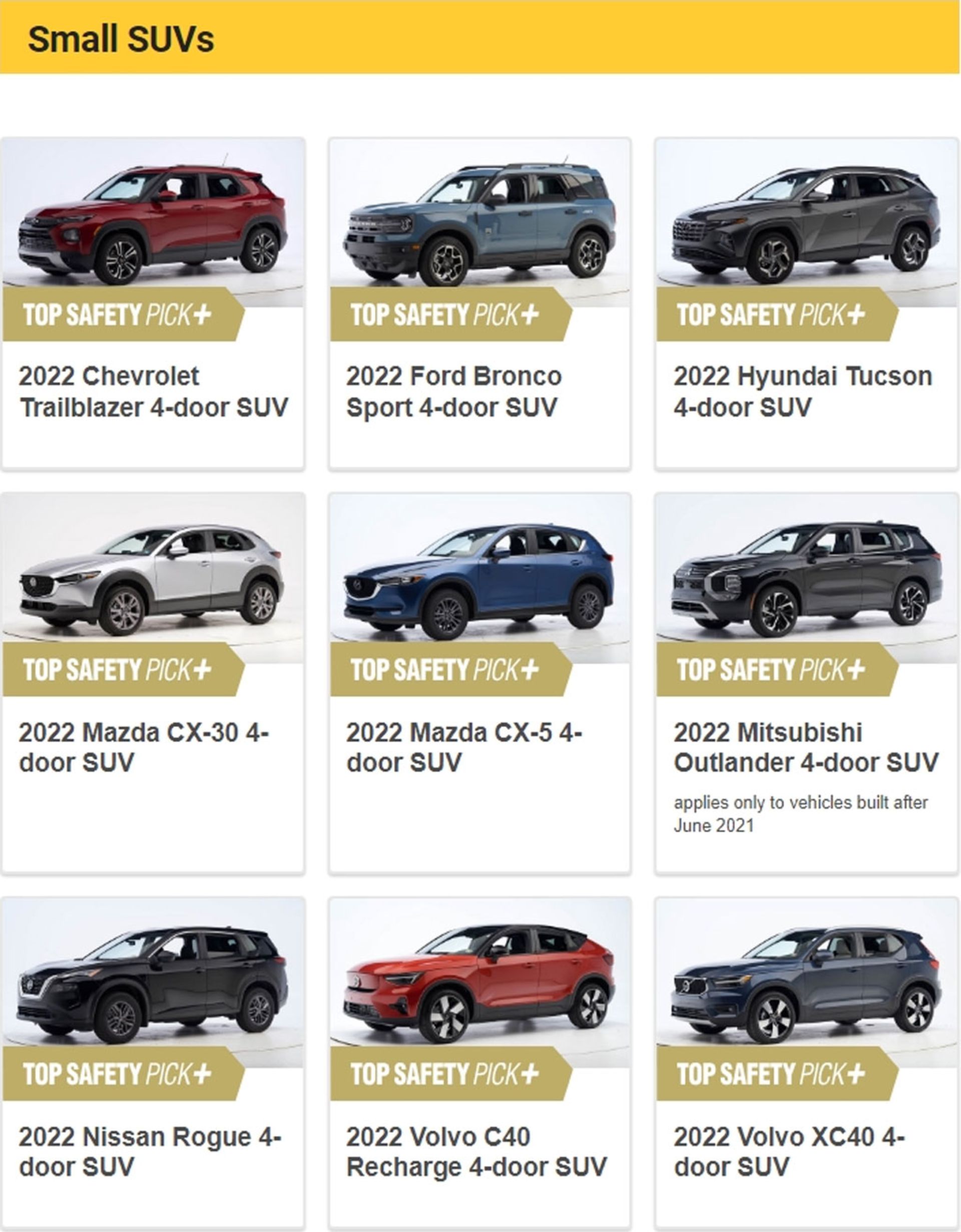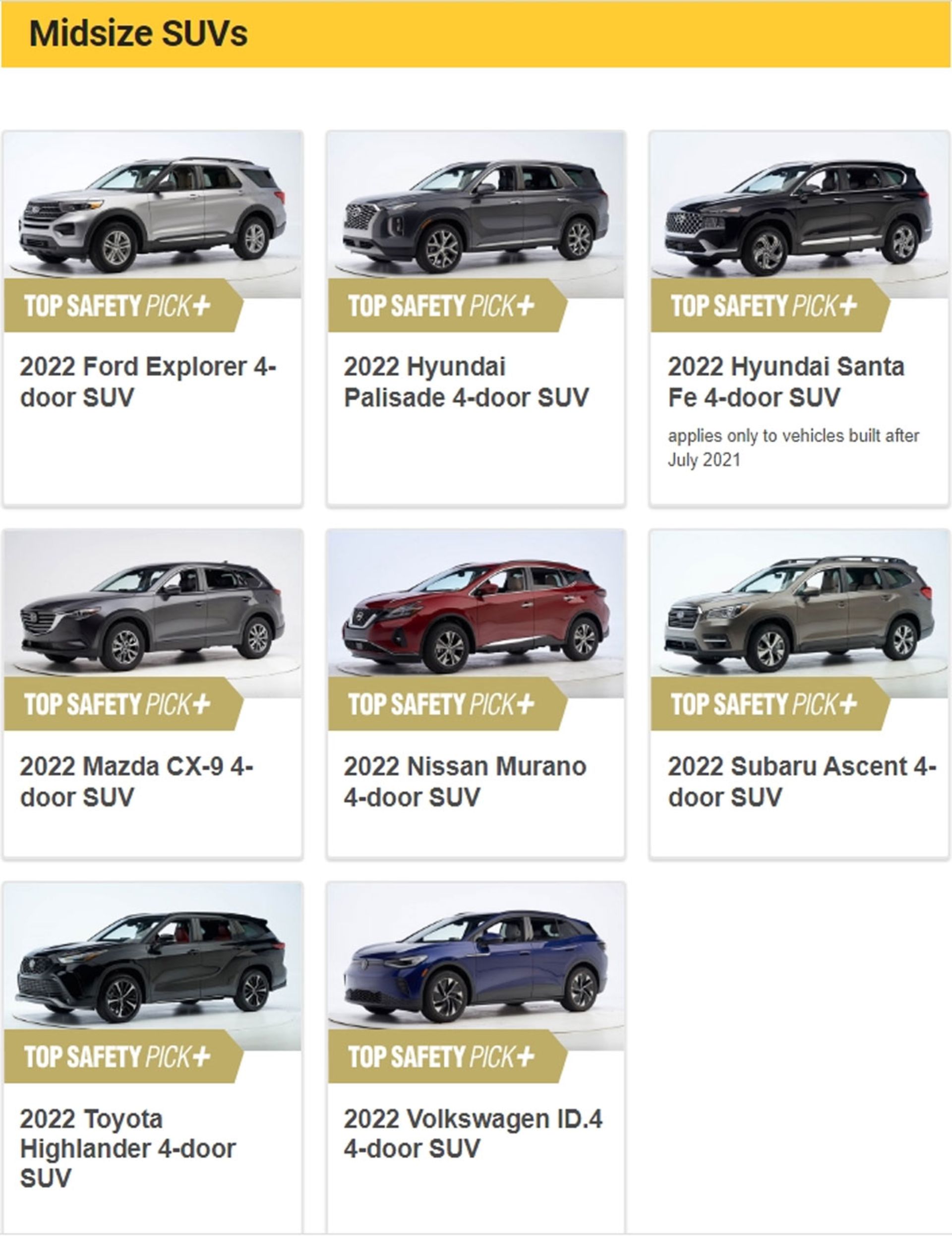 موسسهٔ بیمه برای ایمنی بزرگراهها یا IIHS لیست ایمنترین خودروهای سال 2022 را در قالب جوایز Top Safety Pick و Top Safety Pick+ معرفی کرده است. امسال 65 خودرو موفق به کسب جایزهٔ TSP+ شدهاند و 36 خودرو هم جایزهٔ کمی پایینتر TSP را کسب کردهاند. این یعنی شرایط ایمنی خودروها نسبت به سال 2021 بهبود پیدا کرده است زیرا در این سال 49 خودرو توانستند جایزهٔ TSP+ و 41 خودرو جایزهٔ TSP را از آن خود کنند.