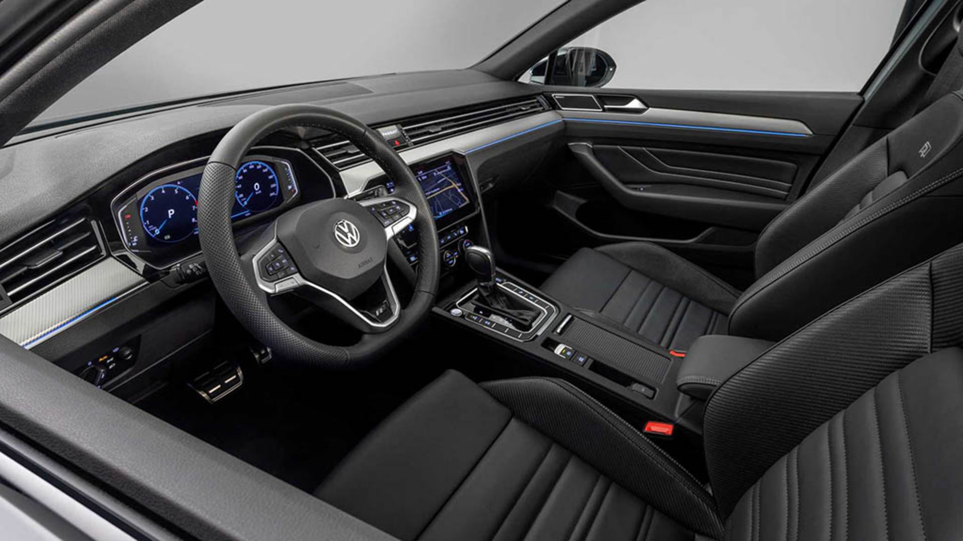 زمانی که داخل کابین شوید فوراً متوجه طرح مشکی غالبی خواهید شد که شامل صندلیهای اسپورت R-Line با پوشش چرم ناپا و چرم کربنی میباشد. لوگوی R-Line نیز روی رکابهای جانبی خودنمایی میکند درحالیکه پدالها نیز از جنس فولاد ضدزنگ هستند.